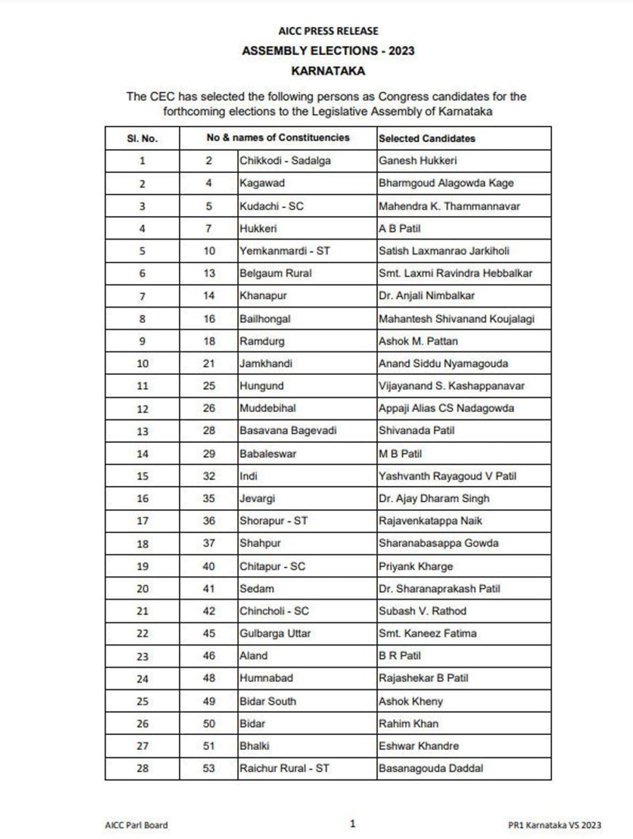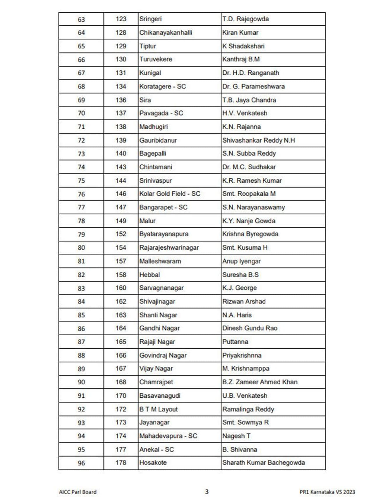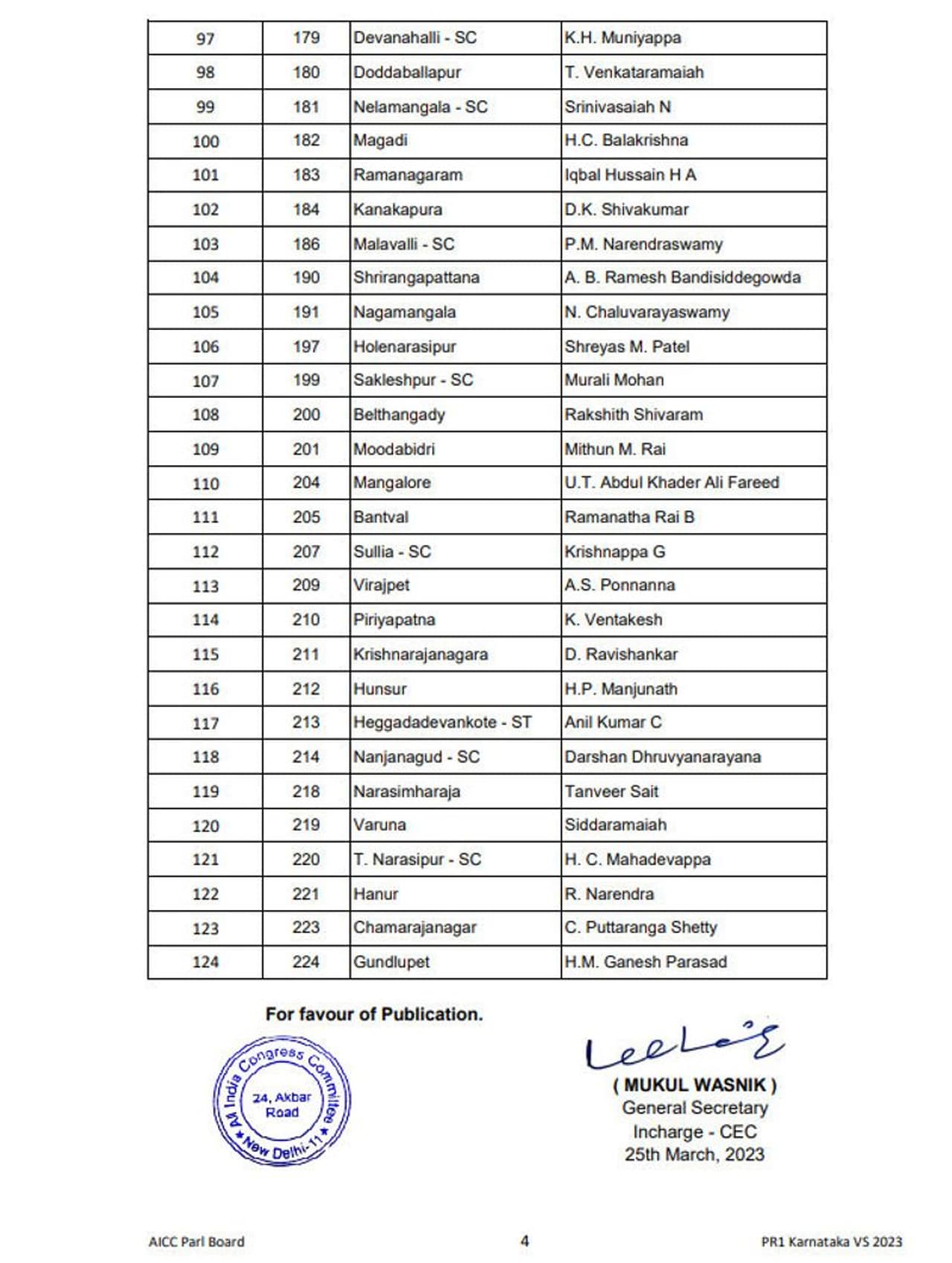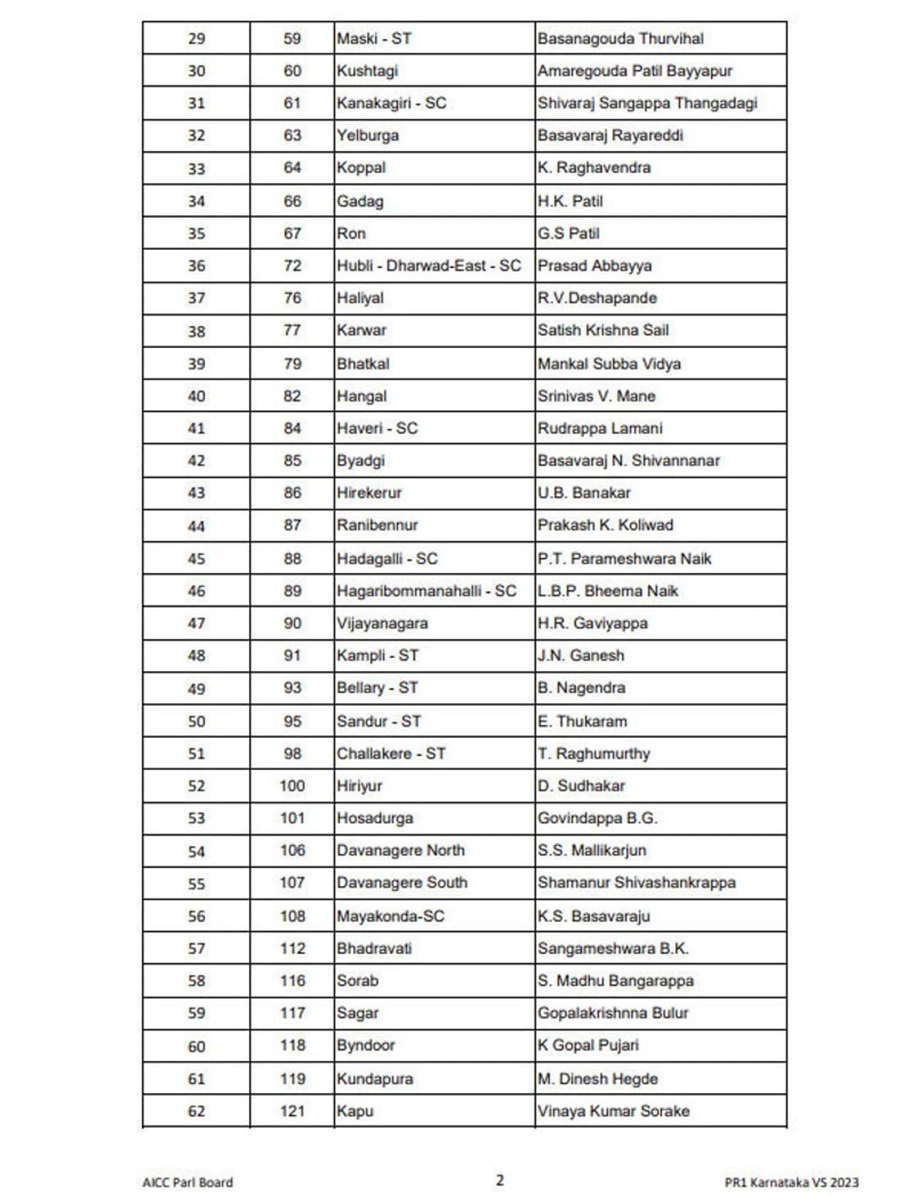 Among senior party leaders who have got the tickets include G Parameshwara-Koratagere. R V Deshpande- Haliyal, H K Patil-Gadag, M B Batil (campaign committee chief) - Babaleswar, Priyank Kharge (AICC President Mallikarjun Kharge's son)- Chitapur, K R Rameshkumar (former Speaker) -Srinivaspur, Eshwar Khandre (Working President)- Bhalki, Satish Laxmanrao Jarkiholi (Working President)- Yemkanmardi, K J George- Sarvagnanagar, Dinesh Gundu Rao-Gandhi Nagar.
