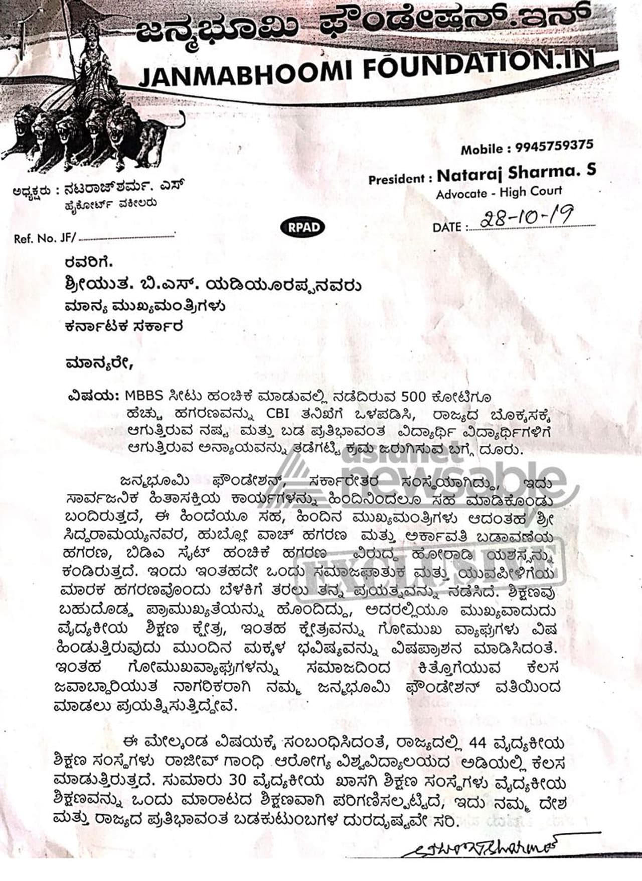 The lawyer, Nataraj Sharma, also the president of Janmabhoomi Foundation, submitted a complete document (which Asianet Newsable is in possession of) to the chief minister's office and has placed a request to initiate an investigation into this multi-crore medical seat scam.