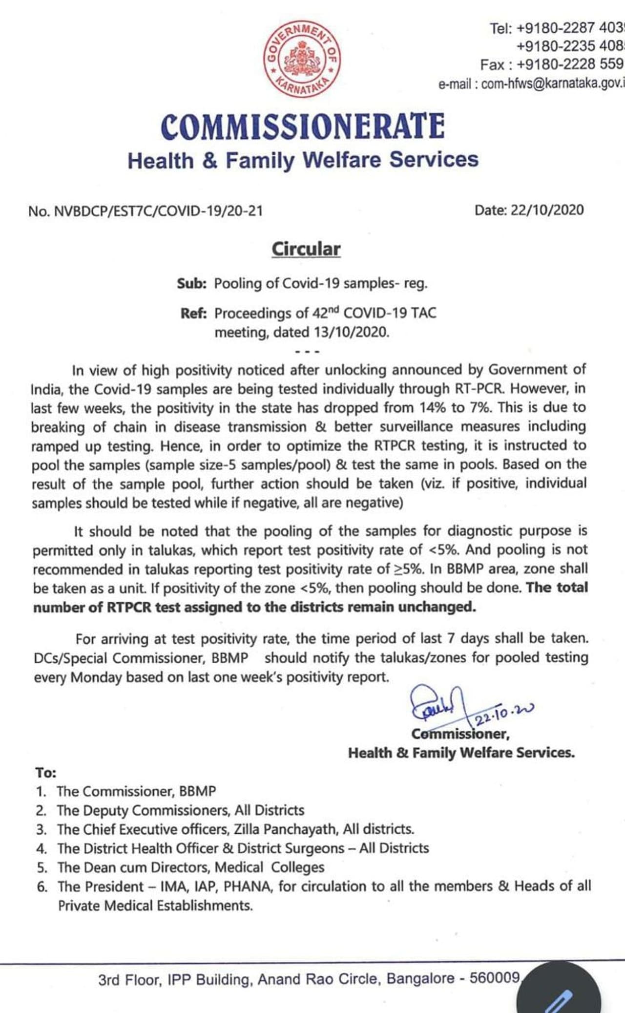 The Commissionerate of Health and Family Welfare services allowed the pooling of COVID-19 samples in districts with less than 5% test positivity rate in the state.