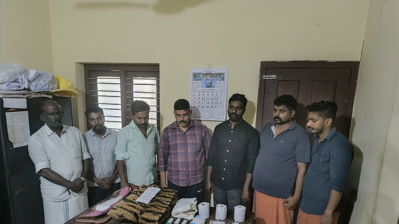 A seven-member gang was nabbed in a joint operation in Kannur, Kerala, for trying to sell tiger skin, teeth, and claws. The arrests followed a secret tip-off. Officials seized the illegal wildlife products, a scooter, and a car used by the gang.