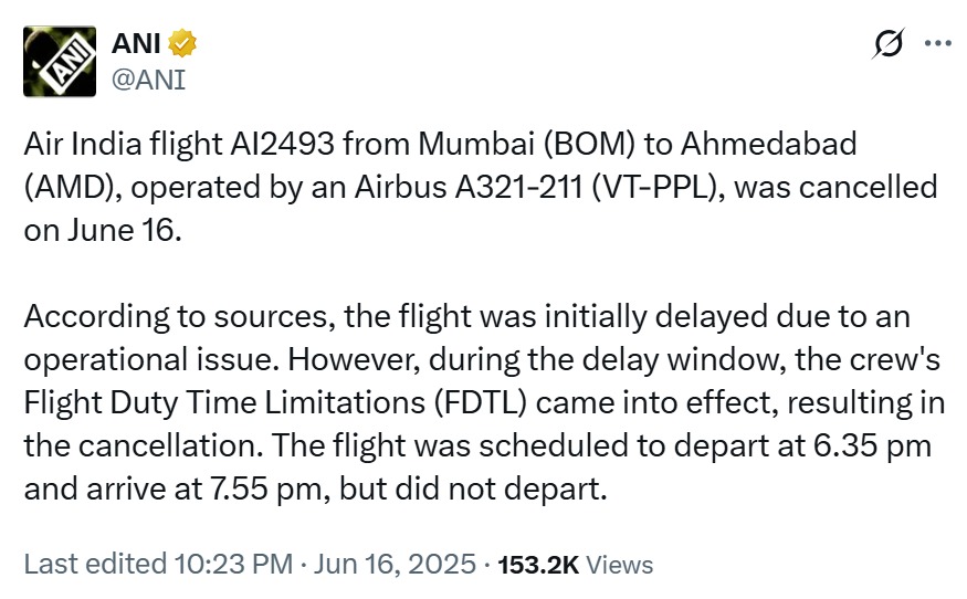 In yet another aviation-related incident, a domestic flight headed to Mumbai was halted at Ahmedabad airport due to a technical issue. The Air India flight AI2493 from Mumbai to Ahmedabad, operated by an Airbus A321-211 (VT-PPL), was cancelled on June 16.