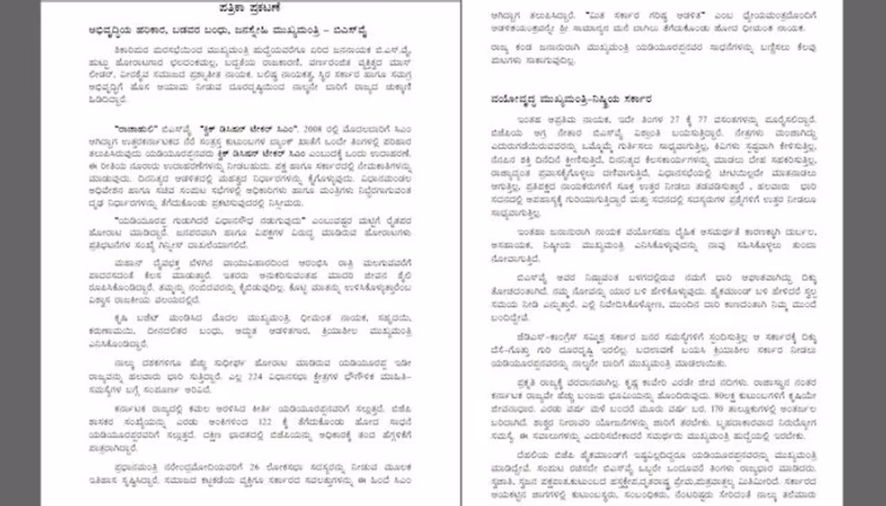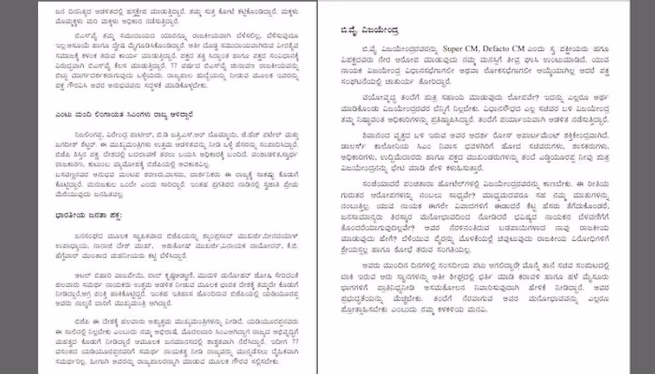 The letter alleges Yediyurappa of not allowing anyone in Veerashaiva-Lingayat community to grow and his son BY Vijayendra is the de facto CM as Yediyurappa has been asking legislators and other party leaders to meet Vijayendra over administrative issues.