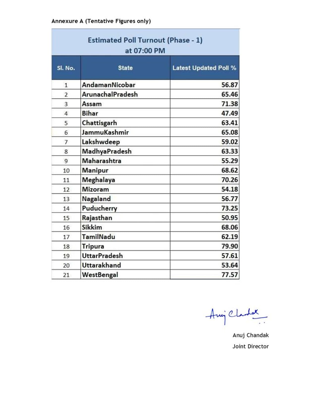 Here's state-wise voter turnout details of Phase 1 at 7 PM: