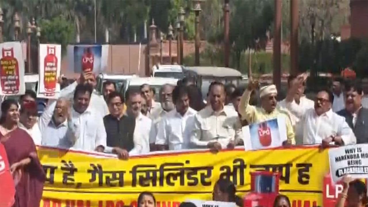 Congress leaders led by Rahul Gandhi protested a nationwide LPG shortage. The crisis, linked to West Asia conflict, has forced restaurants in Bhopal to use induction cooking, while Hyderabad eateries have resorted to using wood amid rising prices.
