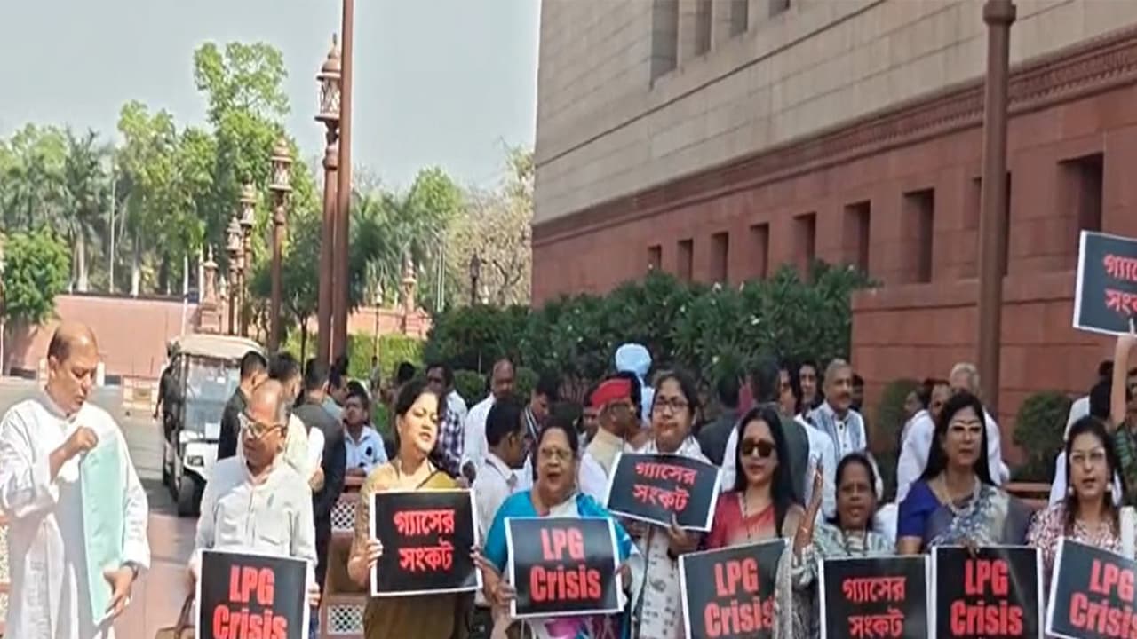 The Trinamool Congress (TMC), along with other opposition MPs, staged a protest at Makar Dwar on the Parliament premises over the shortage of LPG cylinders across the country on Thursday.