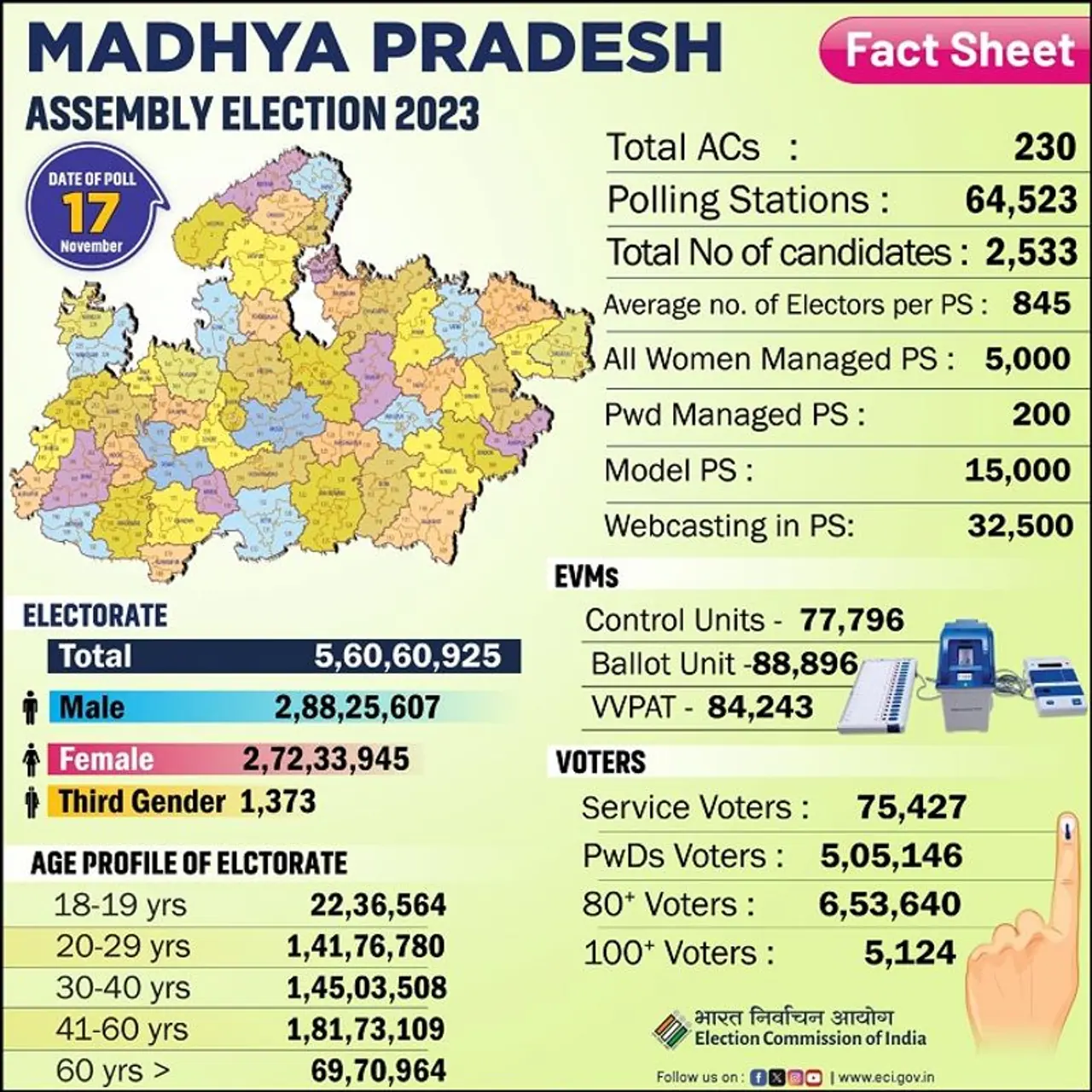The election commenced at 7 am across the 230 constituencies, where 5.6 crore voters, comprising 2.88 crore males, 2.72 crore females, and 22.36 lakh first-time voters, will exercise their democratic right.