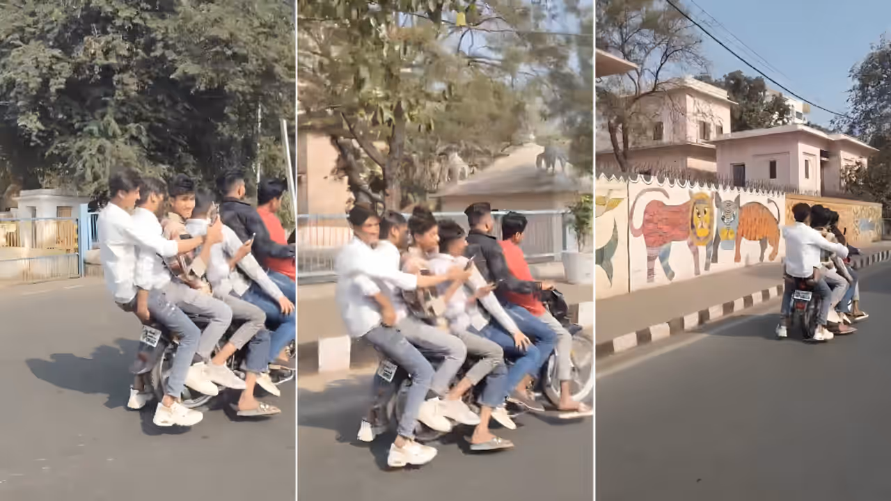 A video showing seven youth riding on a single motorcycle on Bhopal's busy VIP Road has gone viral, drawing public outrage. None of the riders were wearing helmets and were seen laughing while weaving through traffic.