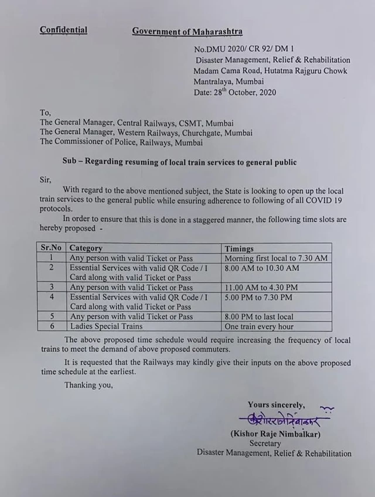Maharashtra government has written to Railways and proposed to restore Mumbai local service for general public & suggested three slots for travel.