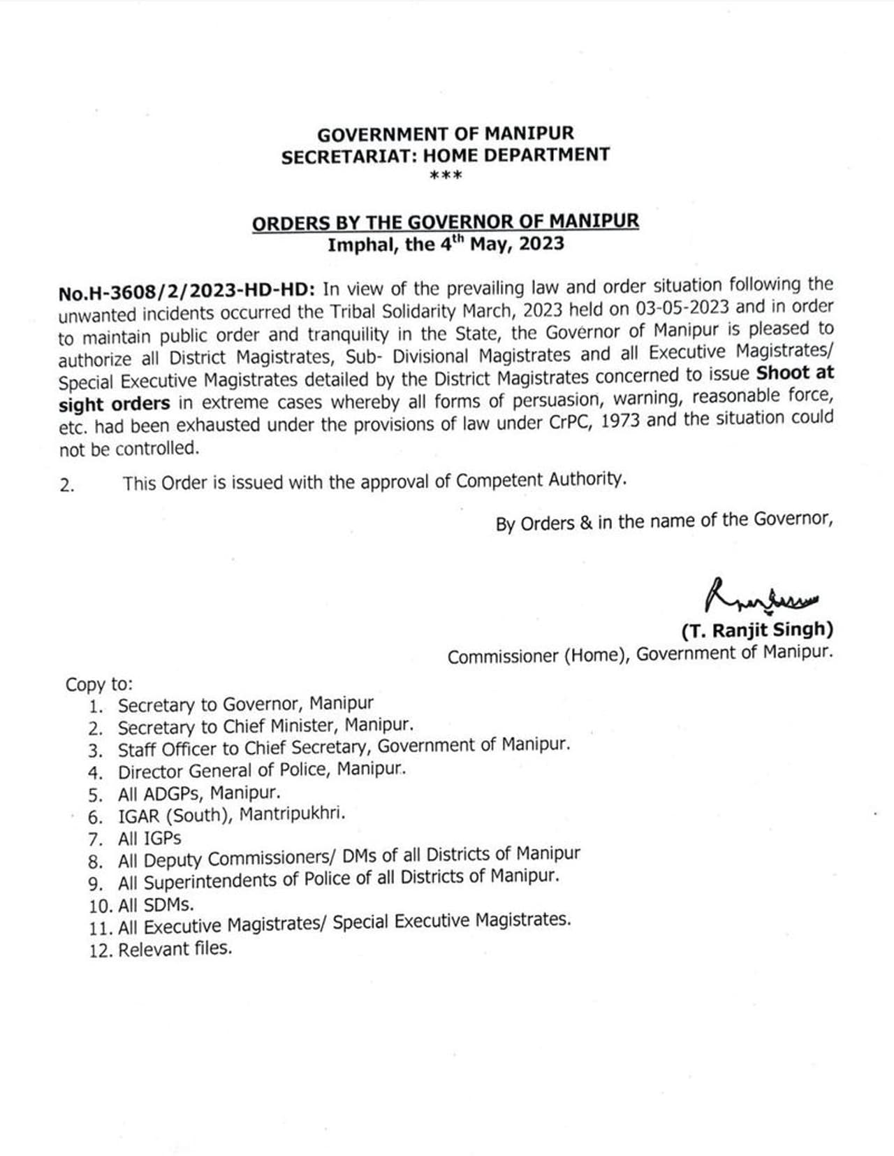 "In view of the prevailing situation following the unwanted incidents occurred the Tribal Solidarity March, 2023, held on 03-04-2023 and in order to maintain public order and tranquility in the State, the Governor of Manipur is pleased to authorise all District Magistrates, Sub-Divisional Magistrates and all Executive Magistrates/Special Executive Magistrates detailed by the District Magistrates concerned to issue shoot at sight orders in extreme cases whereby all forms of persuasion, warning, reasonable force, etc. had been exhausted under the provision of law under CrPC 1973 and the situation could not be controlled," read the May 4th order issued by the Governor of Manipur.