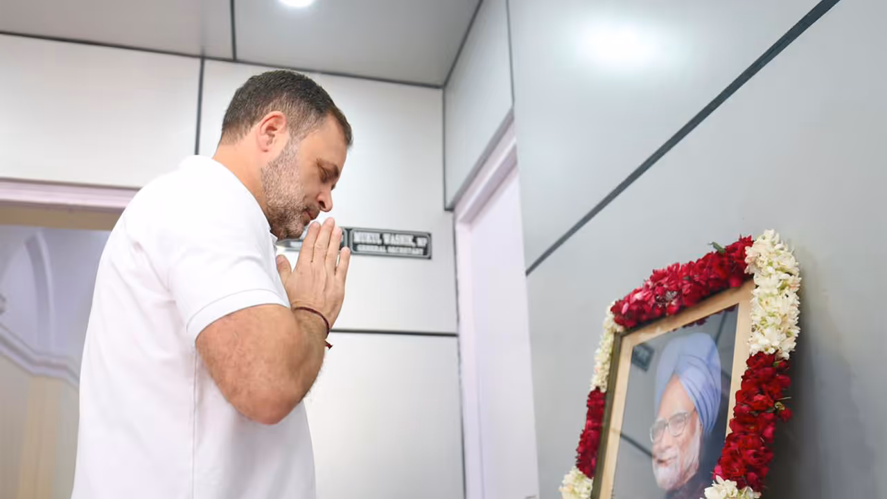 Leader of Opposition Rahul Gandhi pays floral Tributes on the First Death Anniversary of the Former Prime Minister Manmohan Singh at 24, Akbar Road, New Delhi.