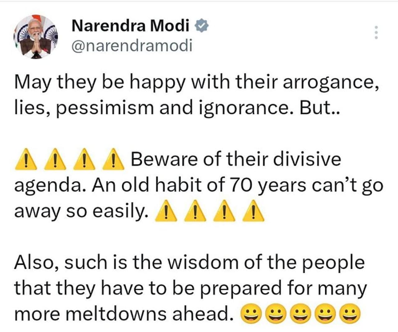 Prime Minister Narendra Modi on Tuesday (December 5) did not hold back in his response to what he termed the "anti-BJP forces" following the Congress party's disappointing performance in the recently concluded assembly elections across the Hindi heartland states. Reacting to a televised news clip, PM Modi took to X to express his sentiments, criticizing the alleged arrogance, lies, pessimism, and ignorance of these opposing leaders.
