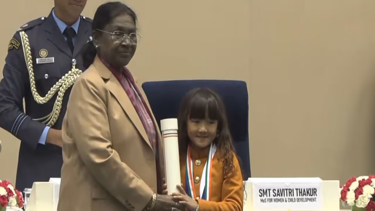 President Droupadi Murmu presented the Pradhan Mantri Rashtriya Bal Puraskar at Rashtrapati Bhavan. Archana Sivaramakrishnan accepted the bravery award on behalf of her late 8-year-old daughter, Vyoma Priya, who lost her life saving a child.