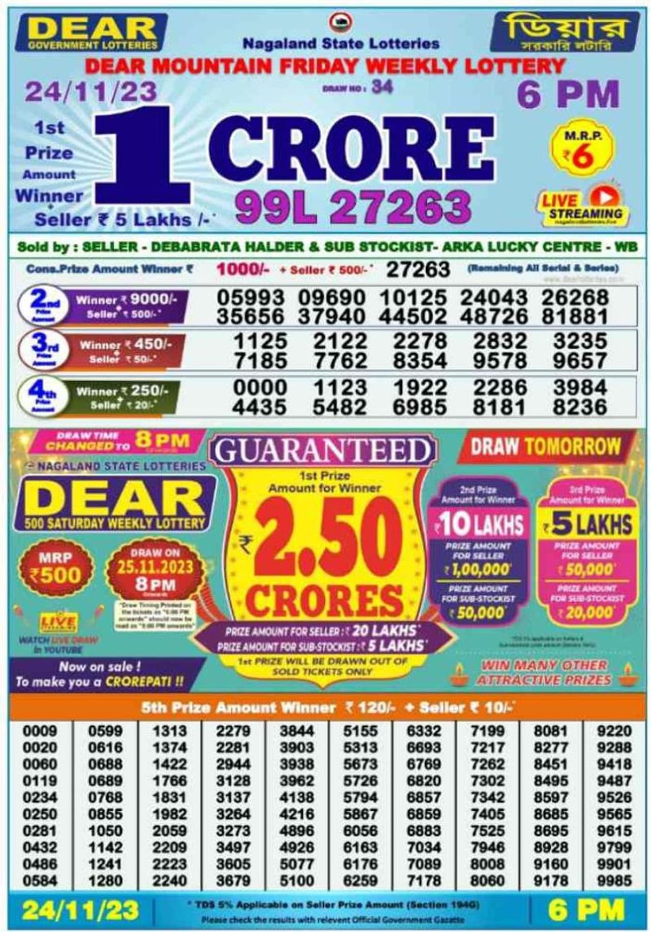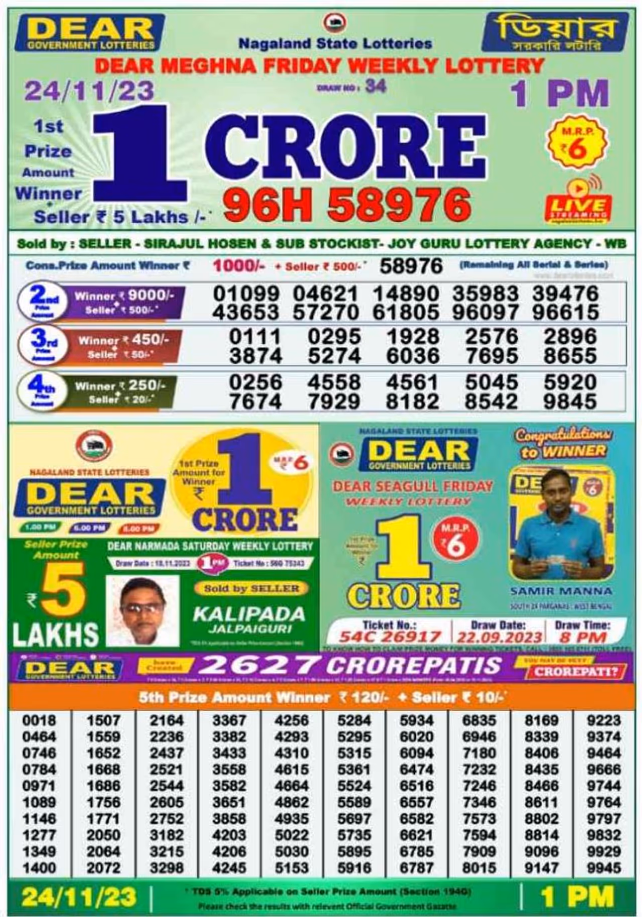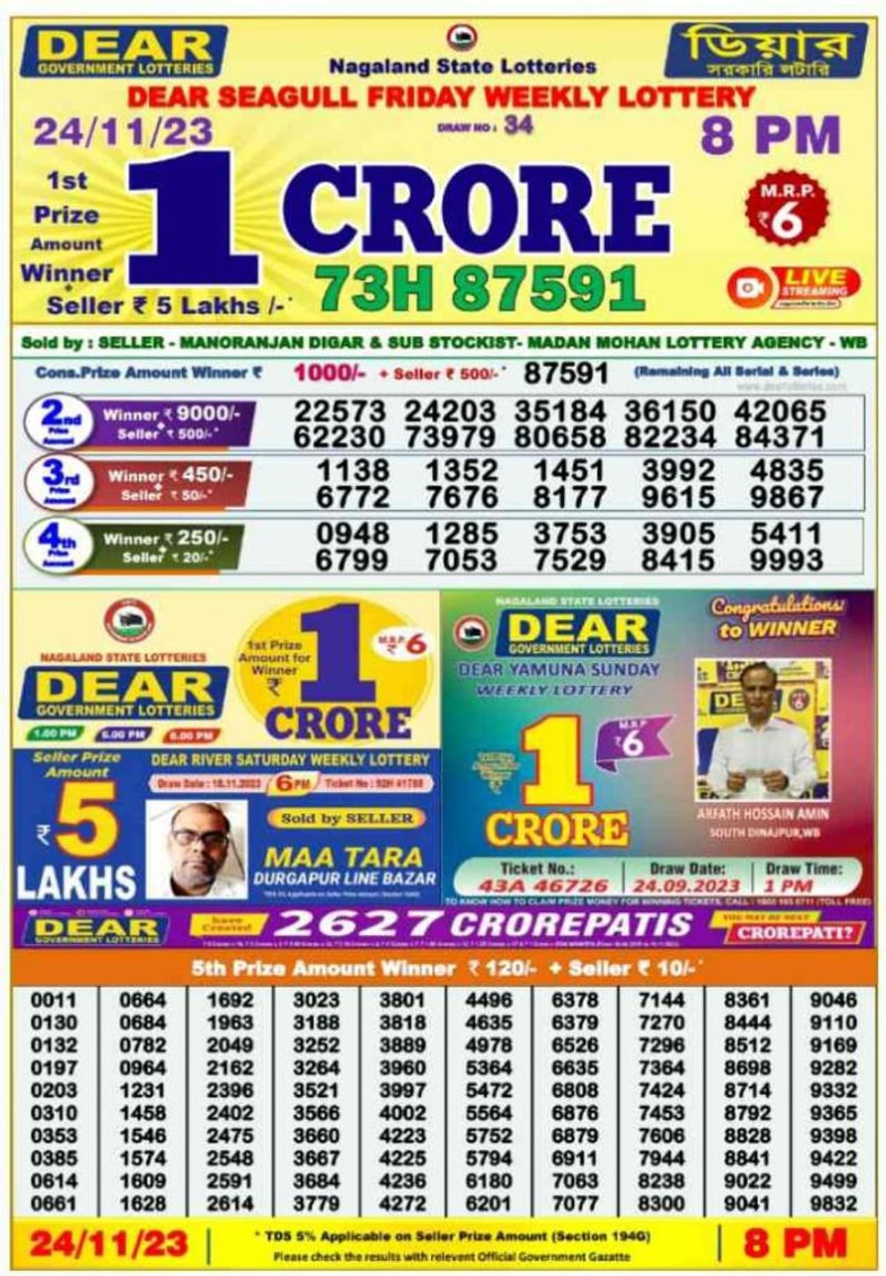 Nagaland Lottery Sambad Result 24-11-2023 Friday Live: Stay updated with the latest Nagaland State Lottery results for the 1 pm, 6 pm, and 8 pm draws on November 24, 2023. The draws, including 'DEAR MEGHNA MORNING', 'DEAR MOUNTAIN EVENING', and 'DEAR SEAGULL NIGHT', offer a first prize of Rs 1 crore each