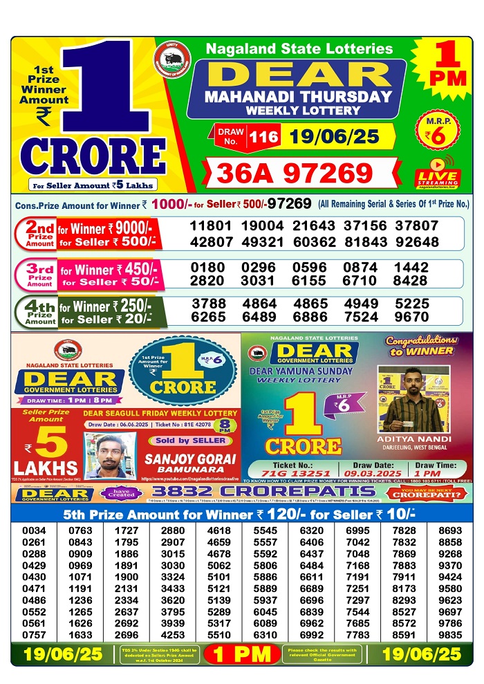 The Nagaland State Lottery continues to draw hopeful participants from across India, with three scheduled draws taking place today—Dear Mahanadi Morning at 1 PM, Dear Dancer Evening at 6 PM, and Dear Sandpiper Night at 8 PM. Each of these lotteries offers a top prize of Rs 1 crore, making it one of the most sought-after legal lotteries in the country.