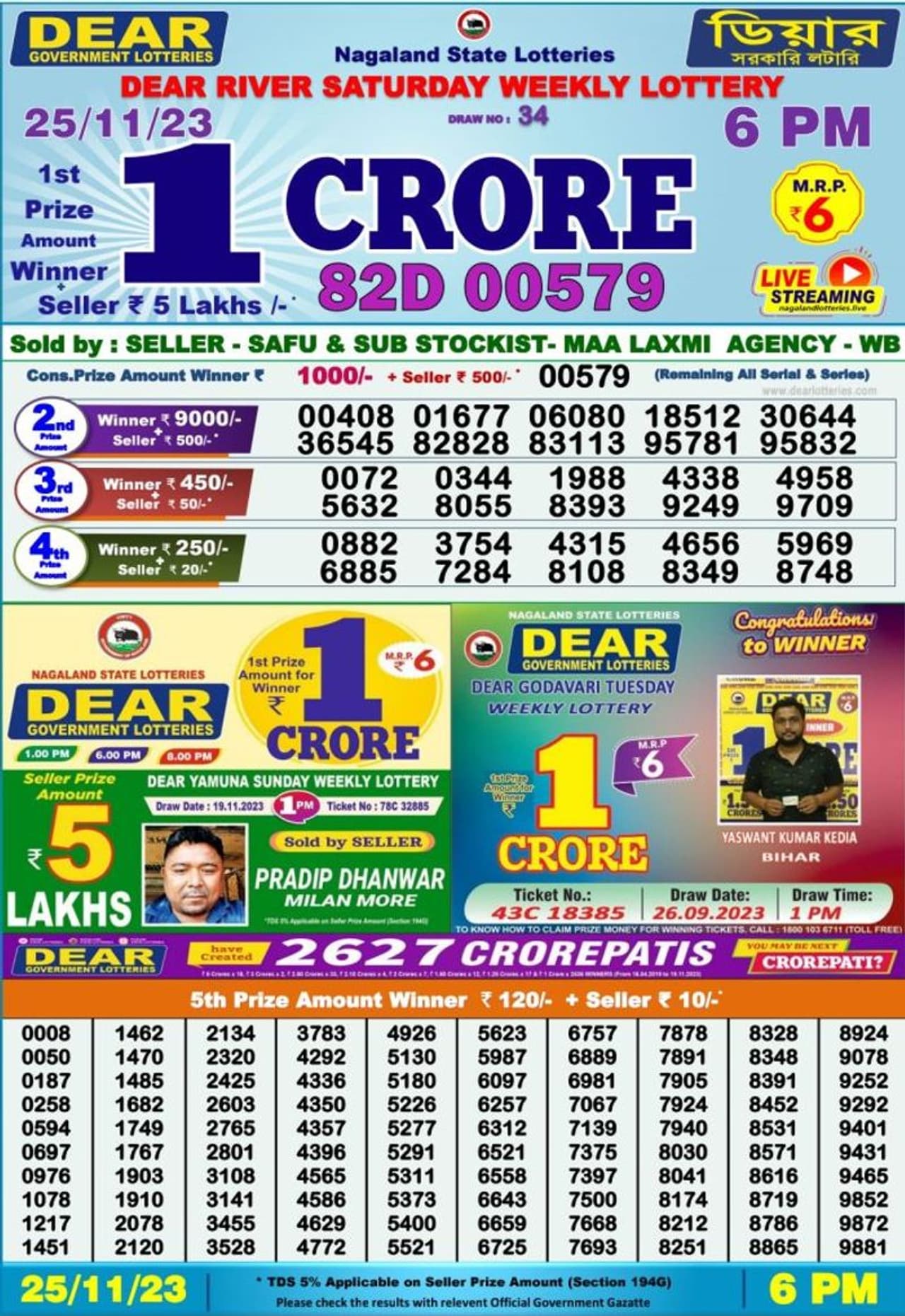 Nagaland State Lottery Sambad 25 November 2023 LIVE UPDATES: The draw results for various ticket categories are announced at specific times, with Saturday's lineup featuring the Dear Narmada draw at 1 pm, Dear River at 6 pm, and Dear Stork at 8 pm.