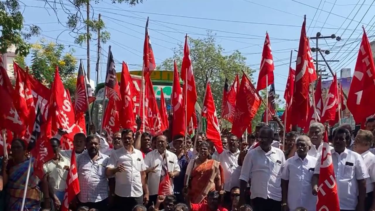 CITU State President Soundararajan strongly criticised the Union Government's labour policies while addressing a protest organised by various trade unions in Guindy, Chennai, as part of the nationwide general strike.