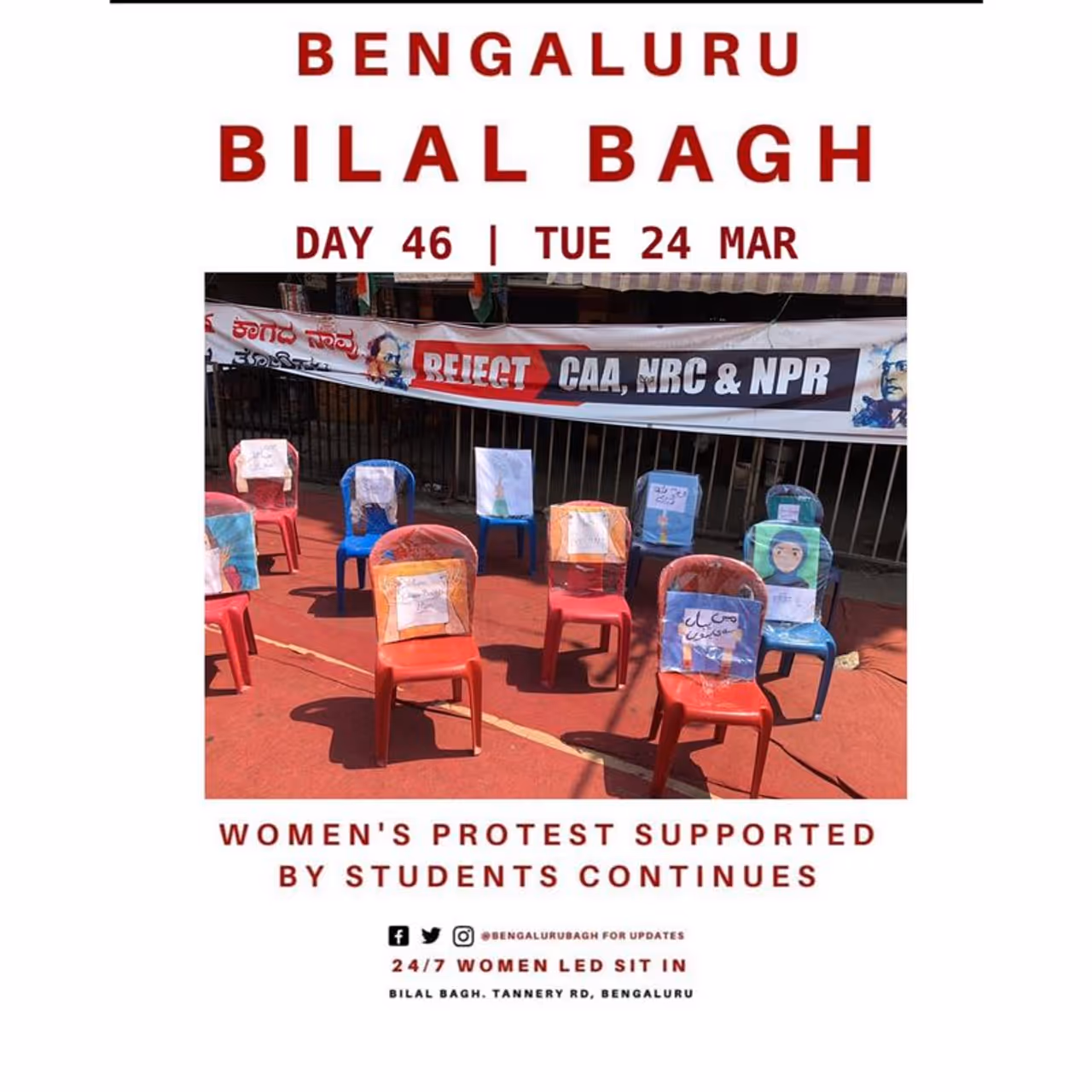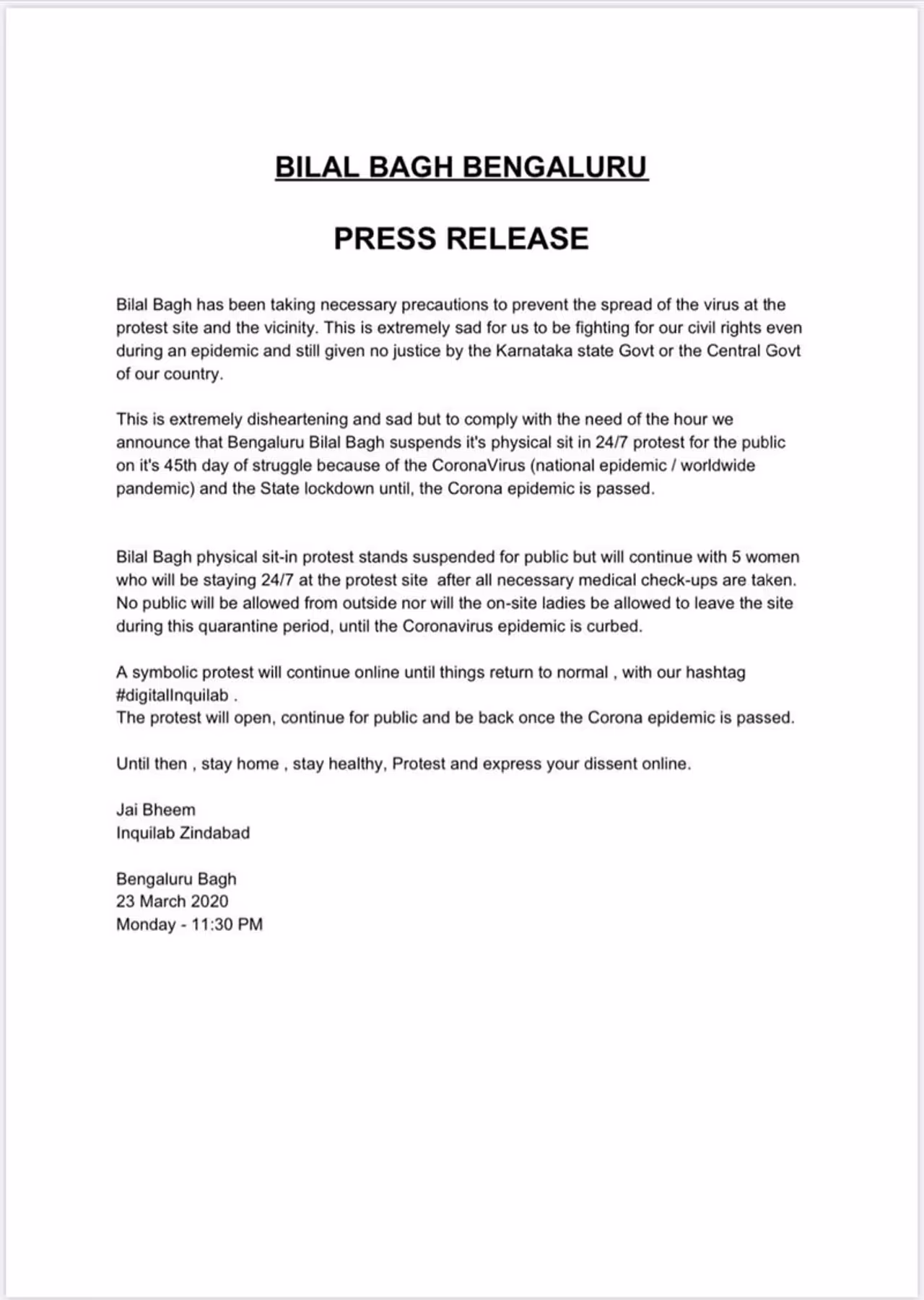 Despite Bengaluru Police’s request to clear the anti-CAA protest site at Bilal Bagh at Tannery Road for the last 46 days, the protesters continued their agitation lending support to Shaheen Bagh protesters in Delhi. Following coronavirus emergency and lockdown in Karnataka, the organisers have decided to break the agitation and go online.