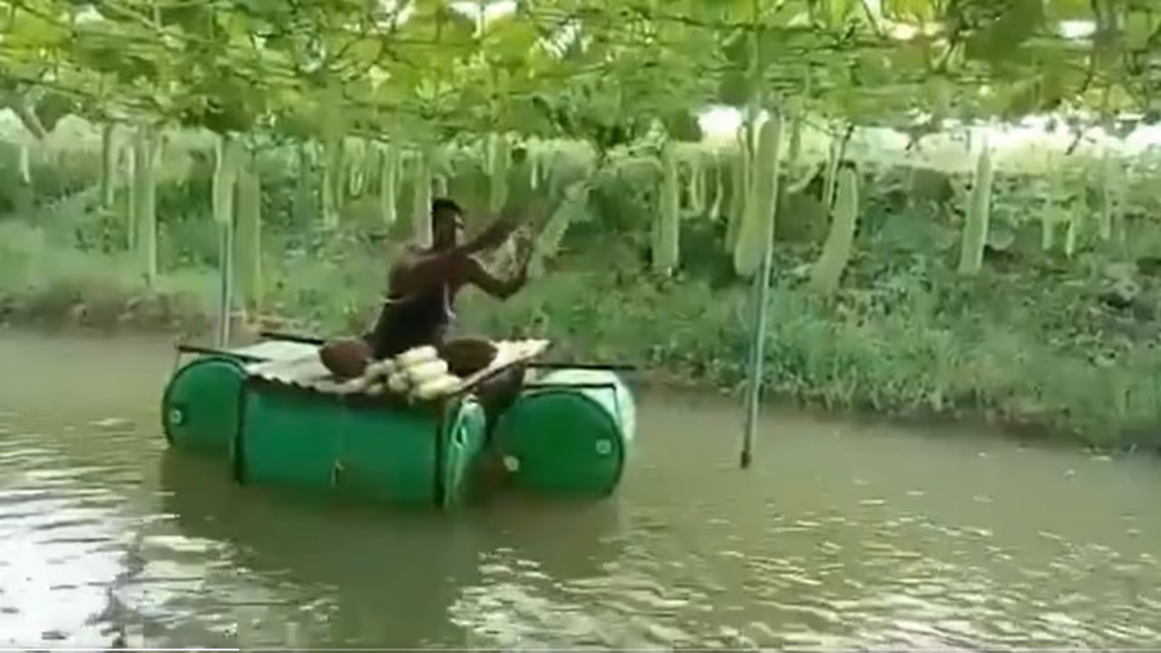 The viral video shows the farmer’s smart integration of vegetable cultivation and fish farming. Above the pond, a sturdy trellis supports climbing vegetables like bottle gourd, flourishing in neat rows. Beneath it, the pond teems with fish, creating two thriving income streams from a single stretch of land.