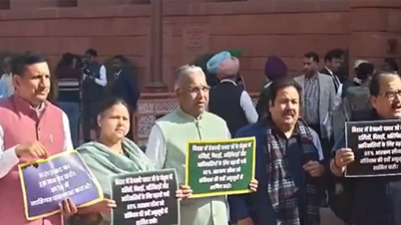 The Rashtriya Janata Dal (RJD) MPs held a protest on Parliament premises on Friday, demanding that Bihar Chief Minister Nitish Kumar and Prime Minister Narendra Modi resign and urging the Centre to enhance the quota for political minorities and OBCs in the reservation policy. The protesters are demanding 65% reservation for scheduled castes, scheduled tribes, Other Backward Classes (OBCs), and Extremely Backward Classes (EBCs), and placing it in the Ninth Schedule of the Constitution. Congress MP Rajeev Shukla also joined the RJD MPs during the protest.