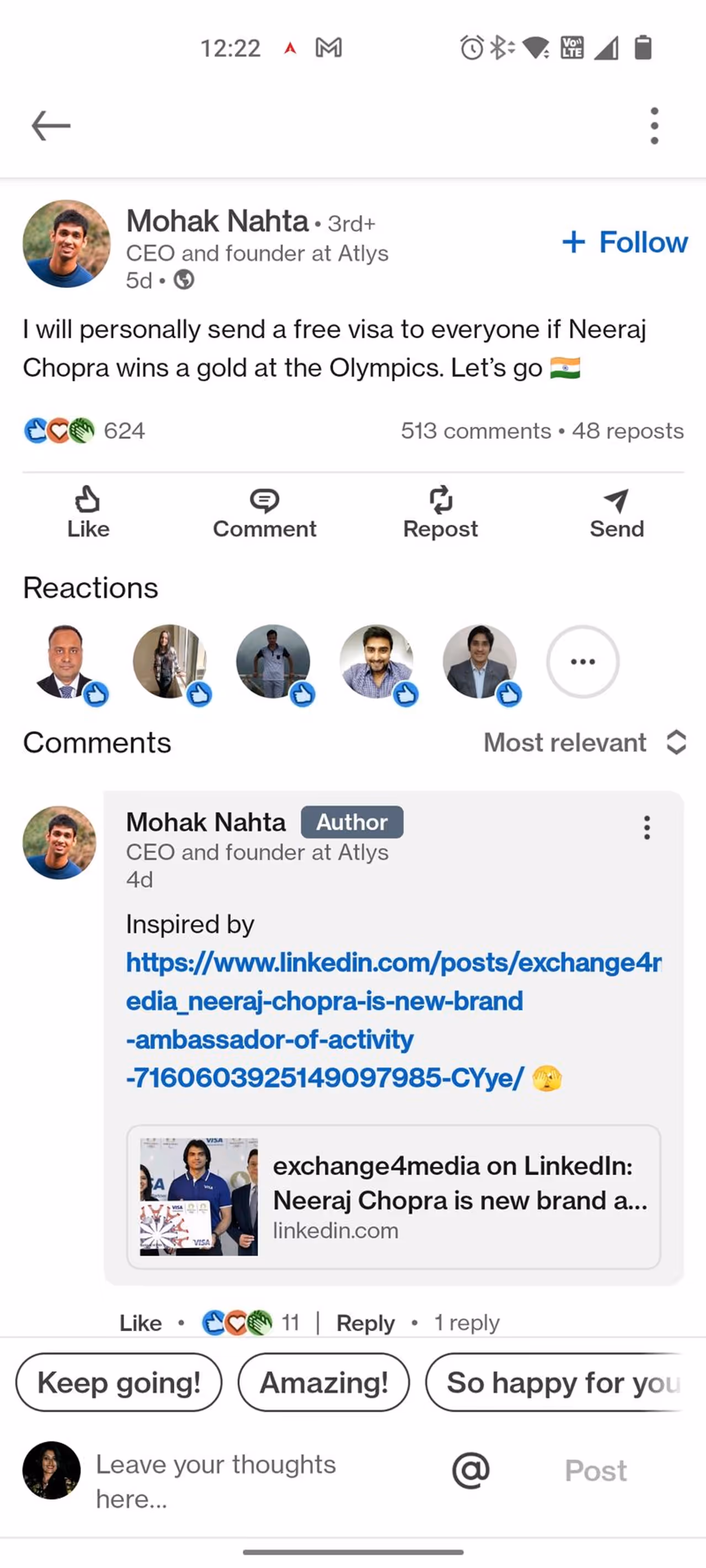Nahta first announced this offer on July 30, stating on LinkedIn, "If Neeraj Chopra secures a gold medal, Atlys will cover the cost of visas for all Indians." However, after Chopra narrowly missed the gold, losing to Pakistan’s Arshad Nadeem, Nahta chose to honor his commitment regardless of the medal's colour.