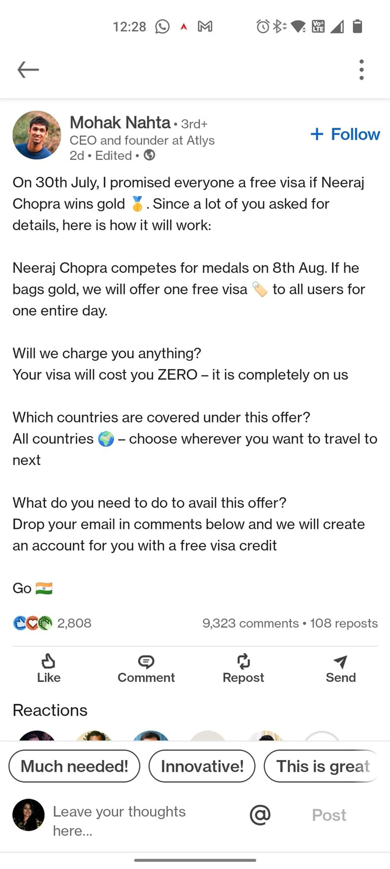 In a commendable move, Mohak Nahta, the Indian-origin CEO of Atlys, on Friday decided to fulfill his promise of offering free visas to all Indians despite Neeraj Chopra's silver medal win at the Paris Olympics.
