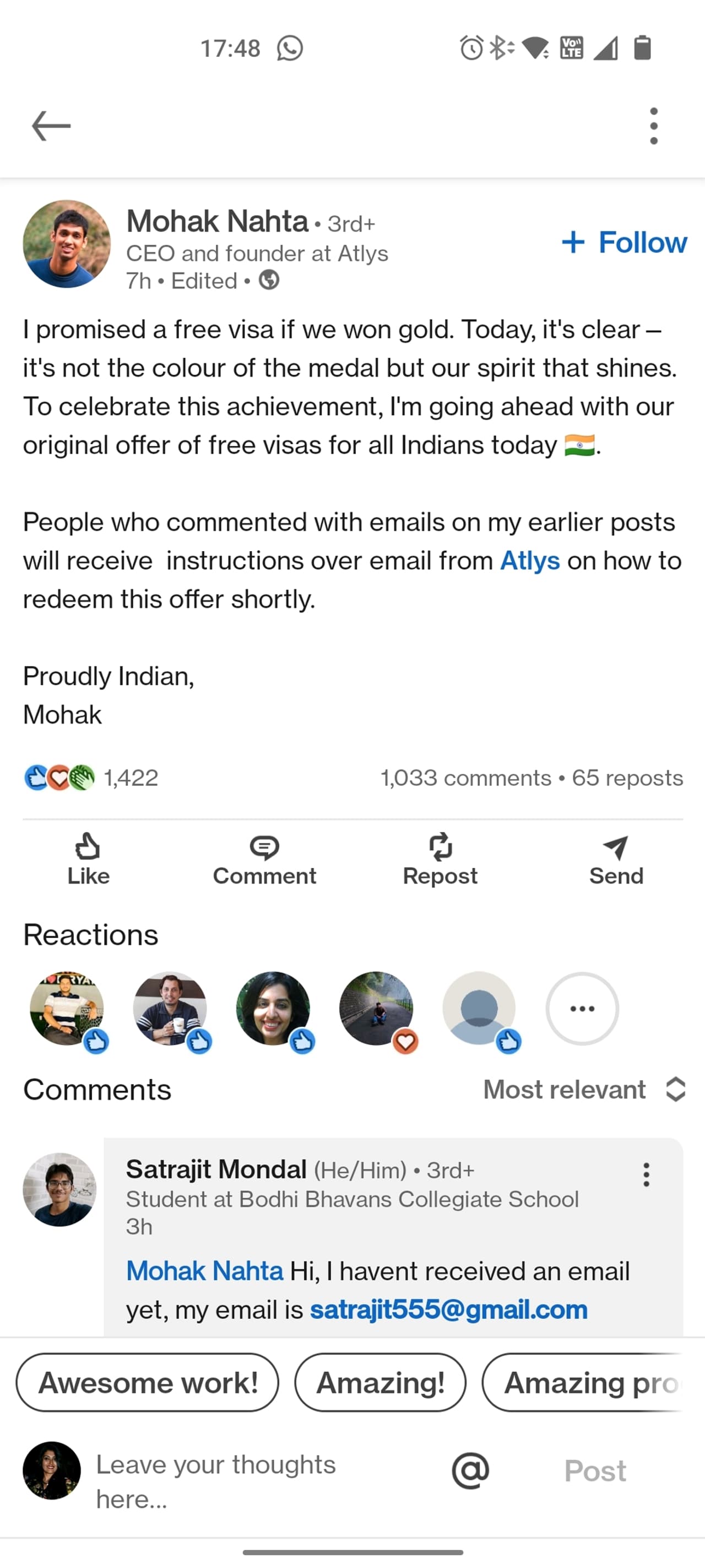 Nahta had earlier outlined the process for claiming the offer. Individuals who had previously commented with their email addresses on his posts would receive detailed instructions from Atlys on how to redeem their free visa. The offer is applicable to all countries, with Atlys providing a visa credit to those who expressed interest.