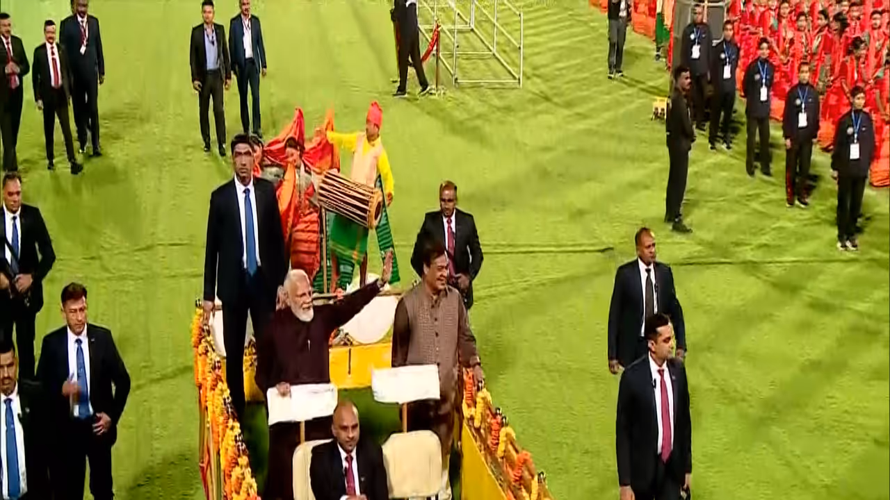 Prime Minister Narendra Modi on Saturday held a grand roadshow at the Sarusajai Stadium in Guwahati, ahead of his participation in the 'Bagurumba Dwhou 2026', a traditional Bodo Cultural Programme. Assam Chief Minister Himanta Biswa Sarma accompanied the Prime Minister during the roadshow, where thousands of supporters welcomed PM Modi with resounding sloganeering.