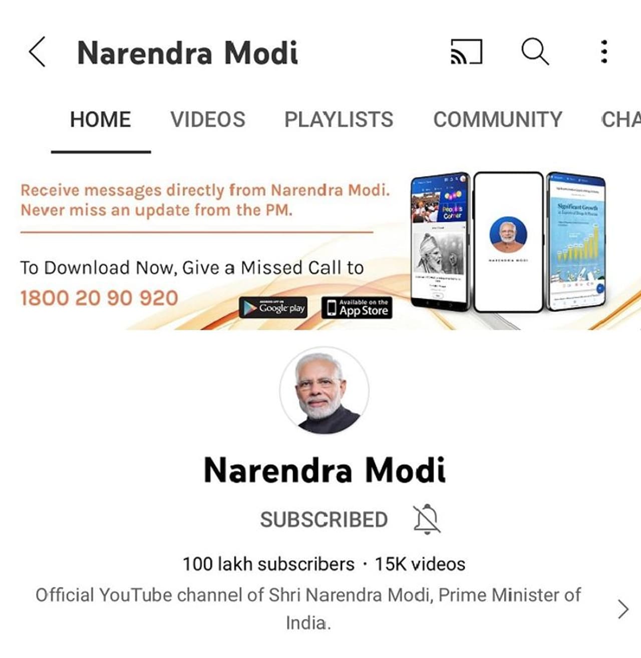 Prime Minister Narendra Modi's Youtube channel on Tuesday crossed 100 lakh subscribers, making him one of the highly followed political leaders on Youtube.