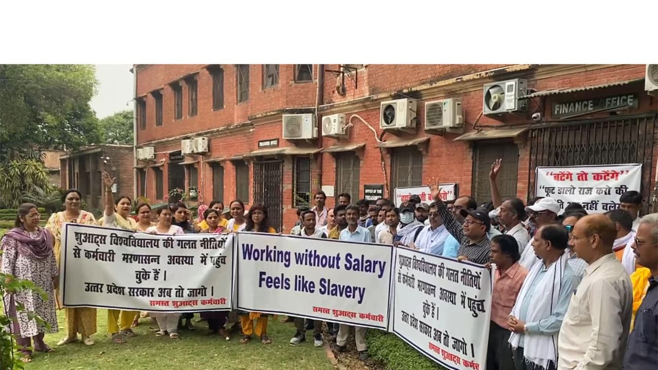 Teachers at SHUATS in Prayagraj protest over unpaid salaries for up to 28 months. They also allege irregularities in promotions and claim they are being pressured to attend religious gatherings, with promotions tied to their participation.