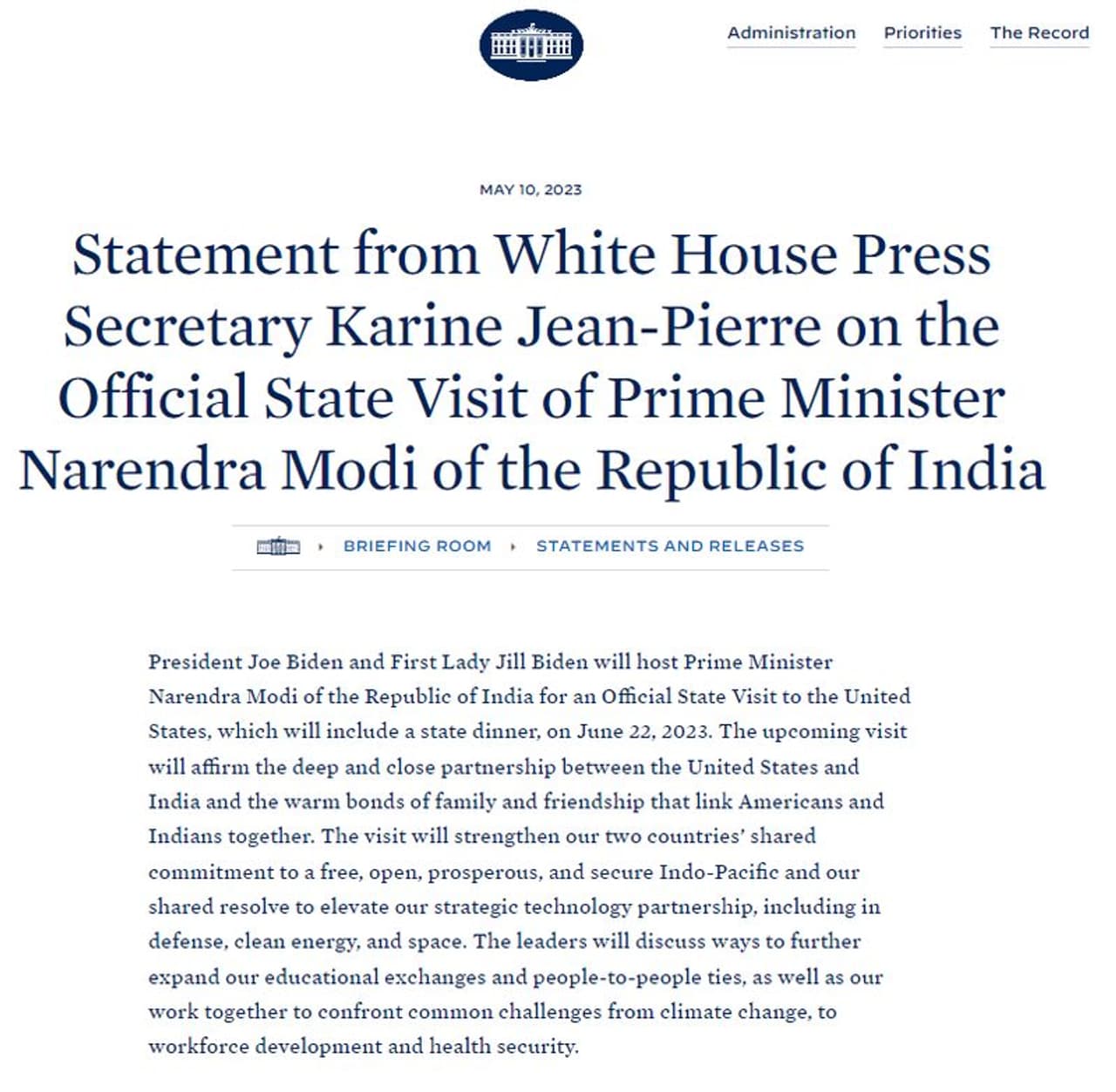 President Biden and the First Lady Dr Jill Biden will host Prime Minister Modi for an Official State Visit to the United States June 22, White House Press Secretary Karine Jean-Pierre said in a statement while announcing the visit.