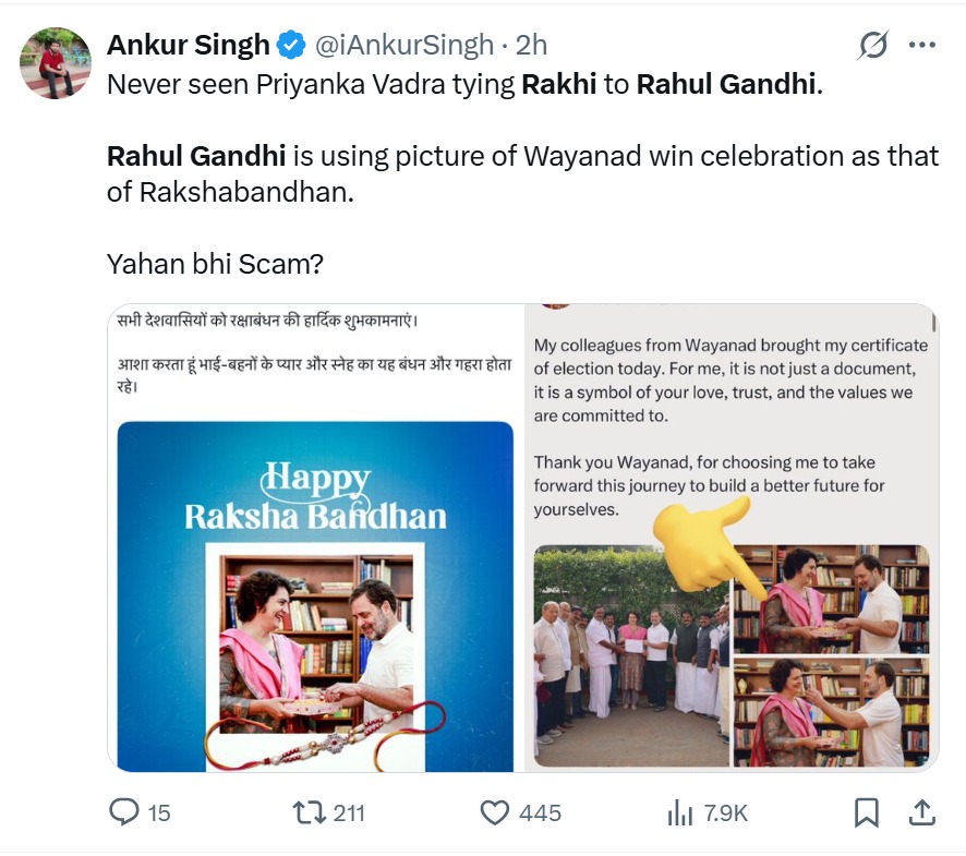 Rahul Gandhi was trolled on X after he posted Raksha Bandhan greetings with a photo of him and his sister, Priyanka Gandhi Vadra. His post drew quick criticism and claims that the picture was not from Rakhi but from Wayanad election celebrations.