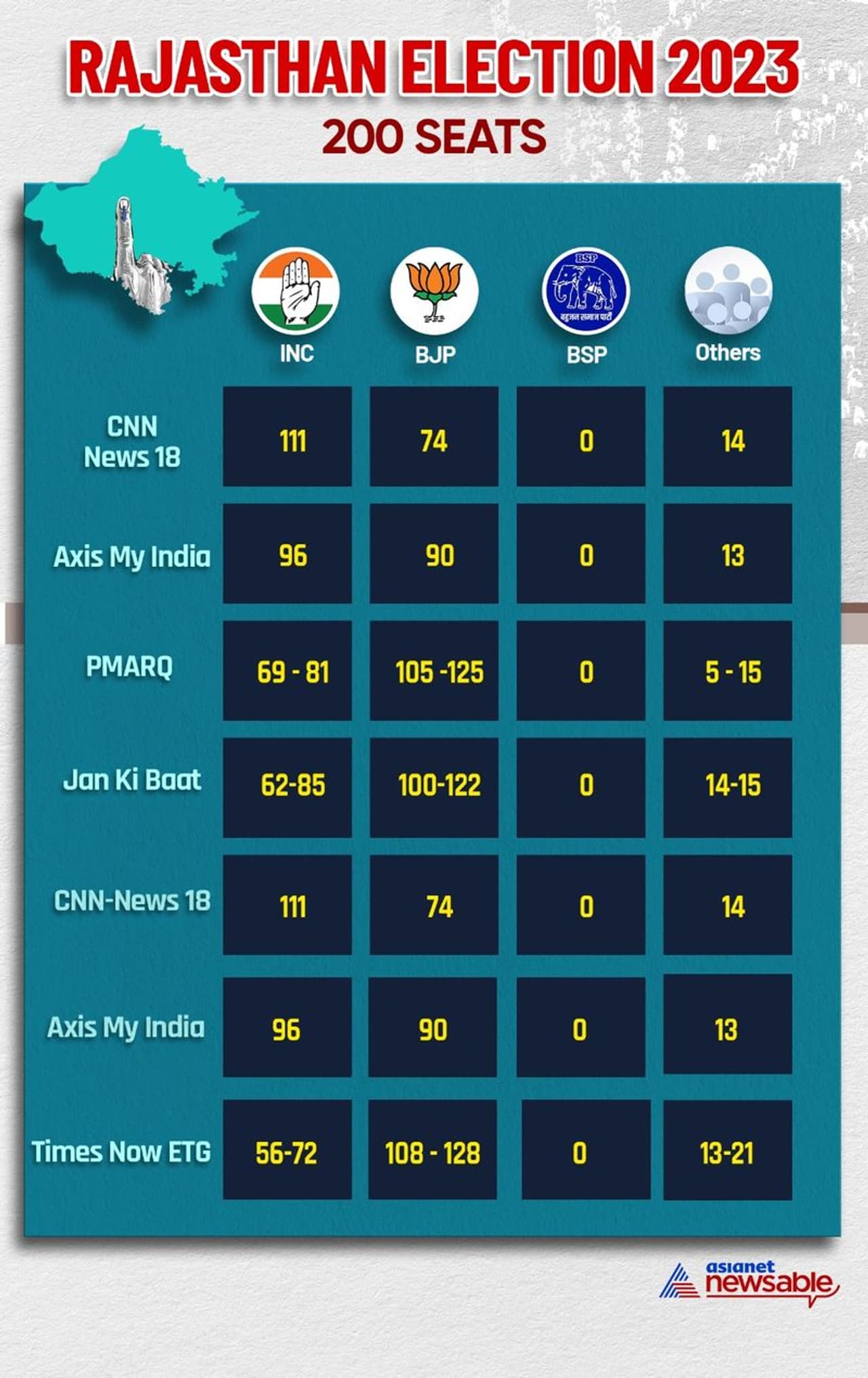 The recent exit polls have revealed that about 96 seats for Congress and 90 for the BJP out of 199 seats in Rajasthan. To form the government in the 200-member House of Rajasthan, a party requires at least 101 seats. These numbers might come as a surprise to the BJP, which had anticipated a return to power. The survey indicates that 42% of people voted for the Congress, while 41% voted for the BJP.