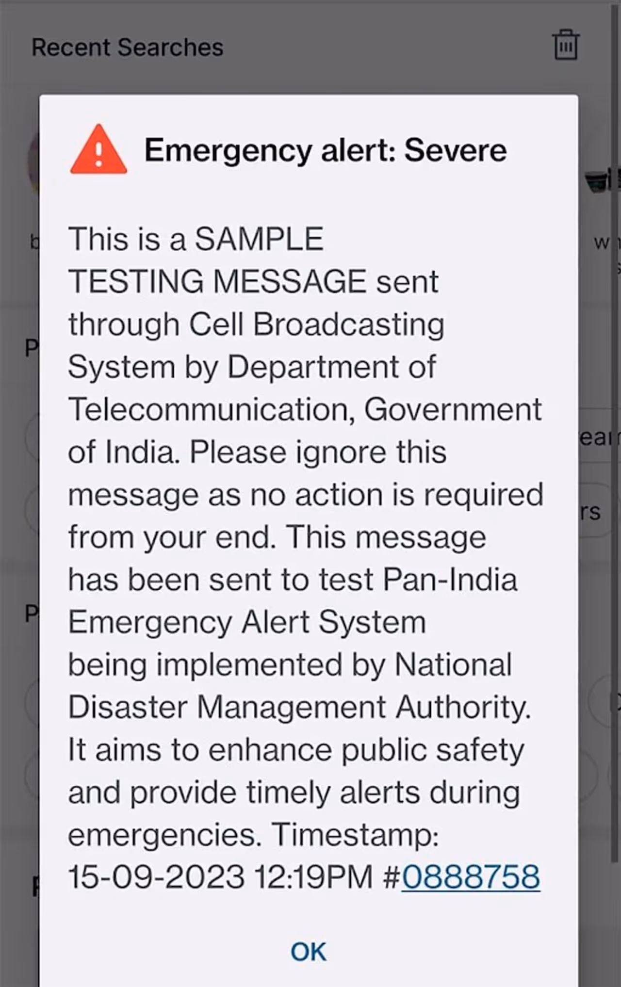 The message, sent through the Cell Broadcasting System by the Department of Telecommunication, Government of India, stated that it was a sample testing message and no action was required. The purpose of these tests is to evaluate the efficiency and effectiveness of emergency warning broadcast capabilities on mobile devices.