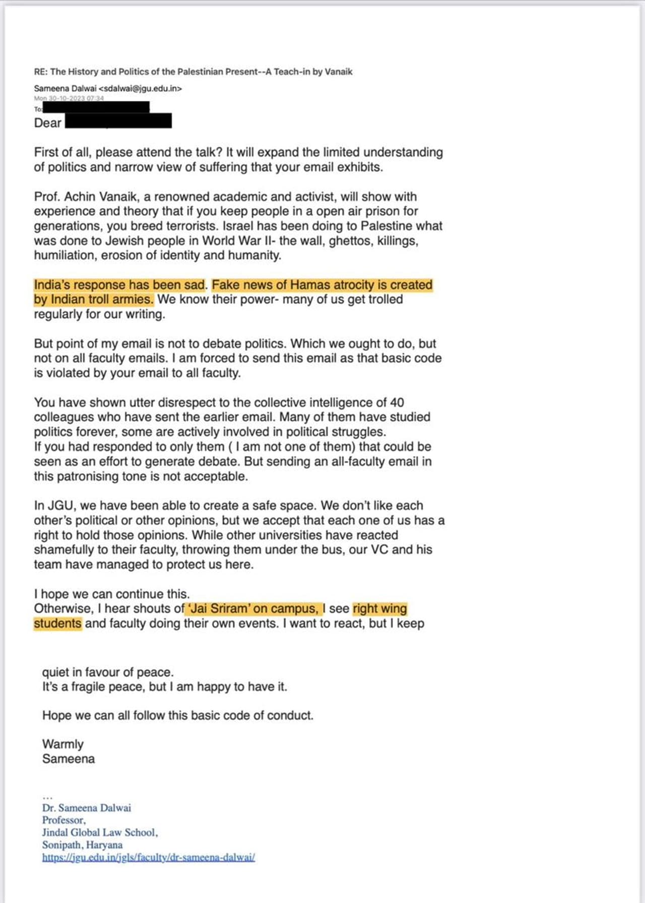 In a recent email related to a talk hosted by OP Jindal Global University, a professor named Dr Sameena Dalwai from Jindal Global Law School made comments that have generated controversy. Dr Dalwai responded to someone who opposed the lecture by Professor Achin Vanaik, who has been described as anti-Hindu and antisemitic.