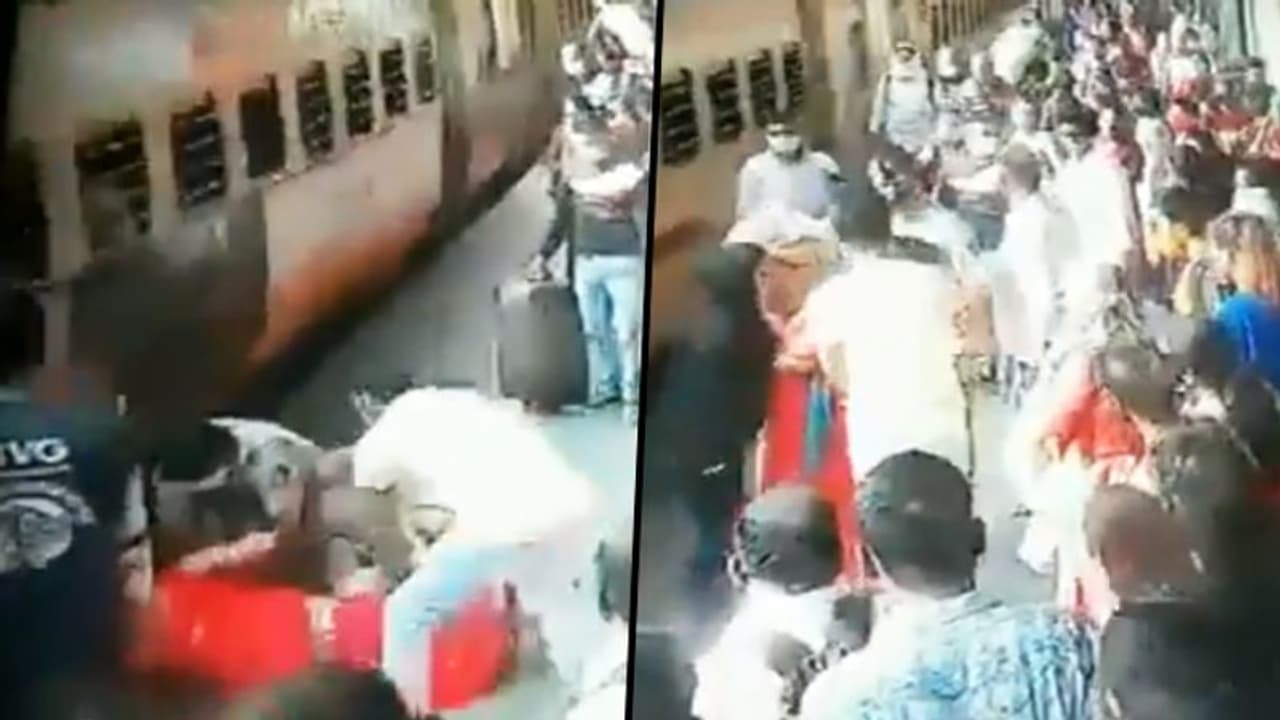 The whole incident was recorded on a CCTV camera. In the video, two security officials — Assistant sub-inspector Sattar Sheikh and sub-inspector Nitin Patil and a civilian rushed and pulled the woman from getting crushed under the running train.