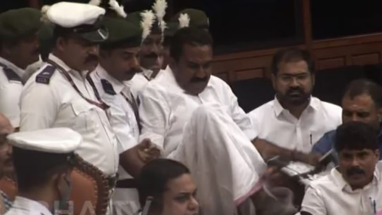 Visuals from the Assembly saw the house watch and ward personnel restrain the opposition members and as the protest intensified, Speaker A N Shamseer got up from his seat and left. The House proceedings were then temporarily suspended.