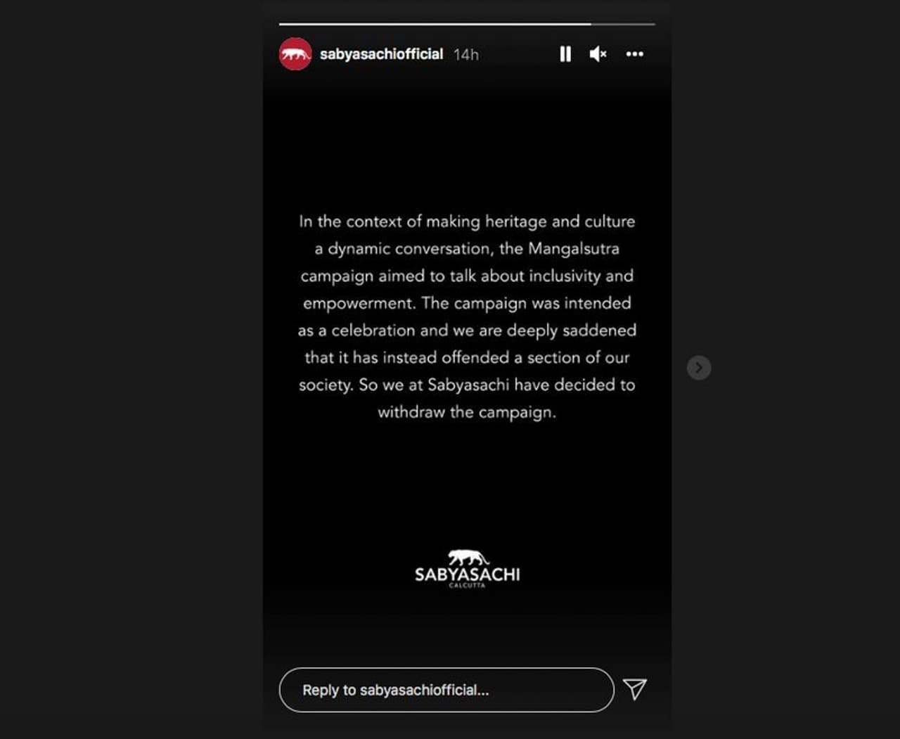 In an Instagram story, the designer's firm stated: "The advertisement was meant to be a celebration, and we are profoundly disappointed that it has insulted a segment of our community. As a result, Sabyasachi has chosen to discontinue the campaign."
