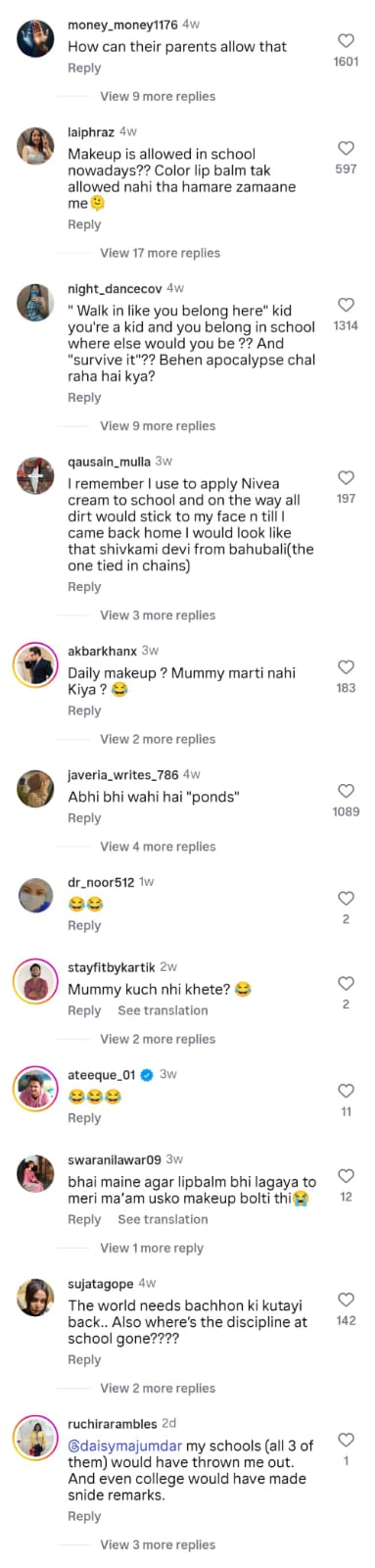 The video caught the eye of content creators, who joked about how different their own school days were. One creator said, "Who are these kids going to school looking as if they're dressed for Sabyasachi’s wedding? At our age, makeup meant pink Ponds powder, Bournvita stains as lip liner, and playground dust as bronzer. In today’s era of Sephora kids, the 90s kids just can’t survive."