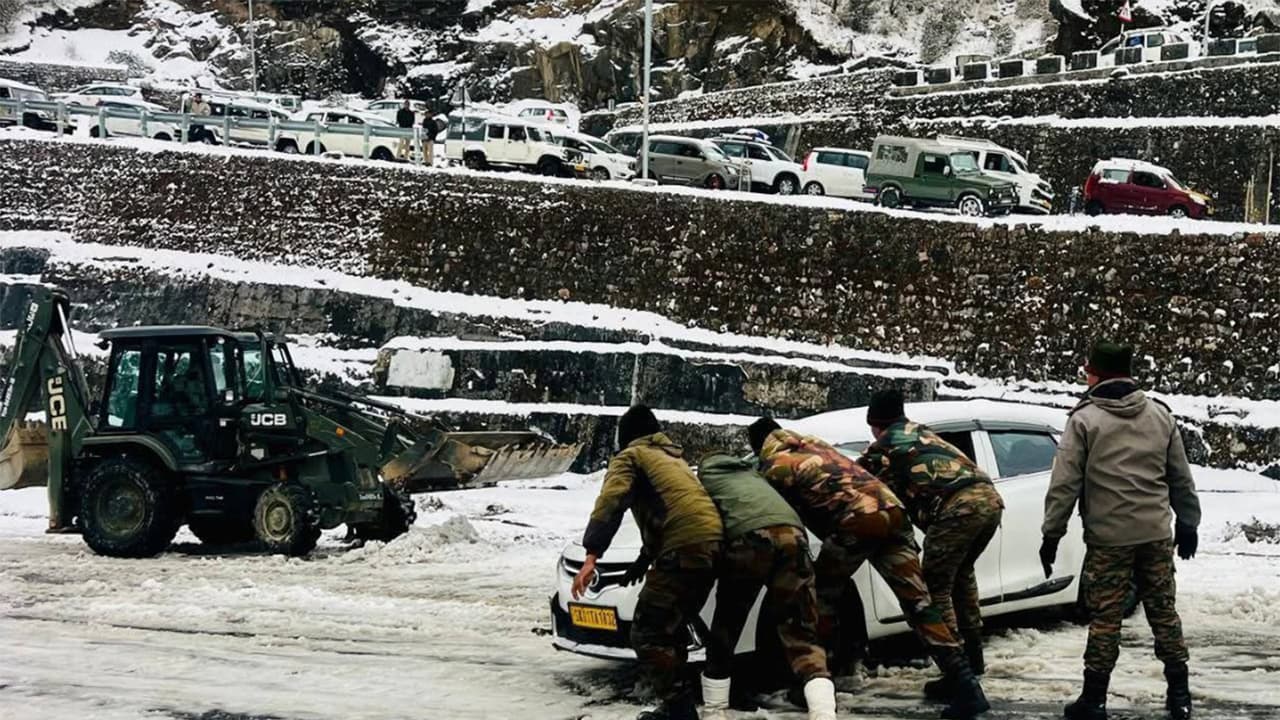 Heavy snowfall in Sikkim has stranded approximately 350 tourist vehicles near Tsangu. The army has suspended traffic, and a multi-agency rescue operation is underway to evacuate tourists, with some already shifted to an Army transit camp.