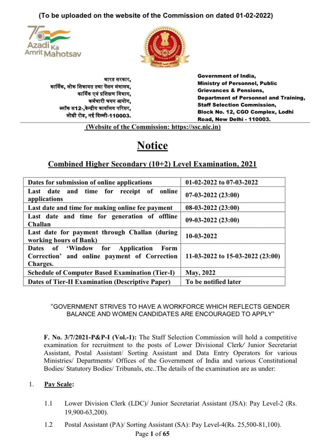 “It is hereby reiterated in the interest of the candidates that aspiring candidates for Combined Higher Secondary (10+2) Level Examination-2021, should submit their online application much before the closing date i.e., 07.03.2022 and not to wait till the last date to avoid the possibility of disconnection/inability or failure to login to the website on account of heavy traffic on the servers during the closing days,” read the official notice.