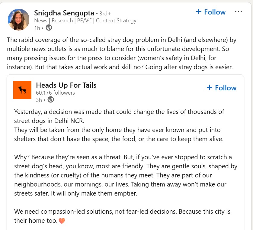 Another LinkedIn post blamed sensational media coverage for fuelling fear about stray dogs. She said the press should focus on more urgent issues, like women’s safety, instead of targeting street animals.