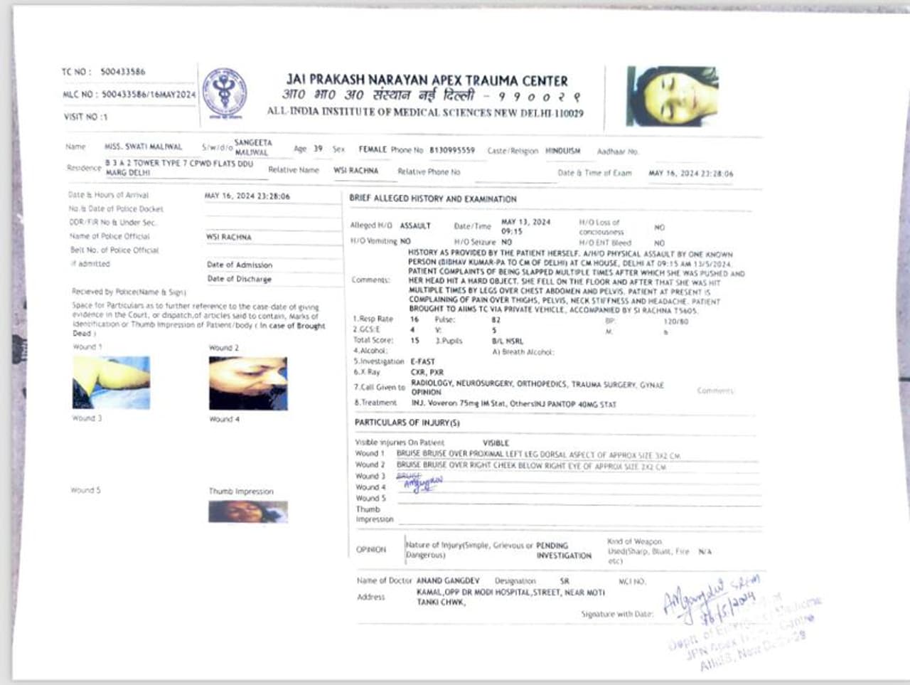 In the latest twist to the political drama surrounding AAP MP Swati Maliwal's assault allegations against Chief Minister Arvind Kejriwal's aide, Bibhav Kumar, the emergence of her medical report adds a significant layer to the unfolding narrative. The medical report confirms injuries to her face and legs, detailing about four major injuries sustained during the alleged incident, according to several media houses.