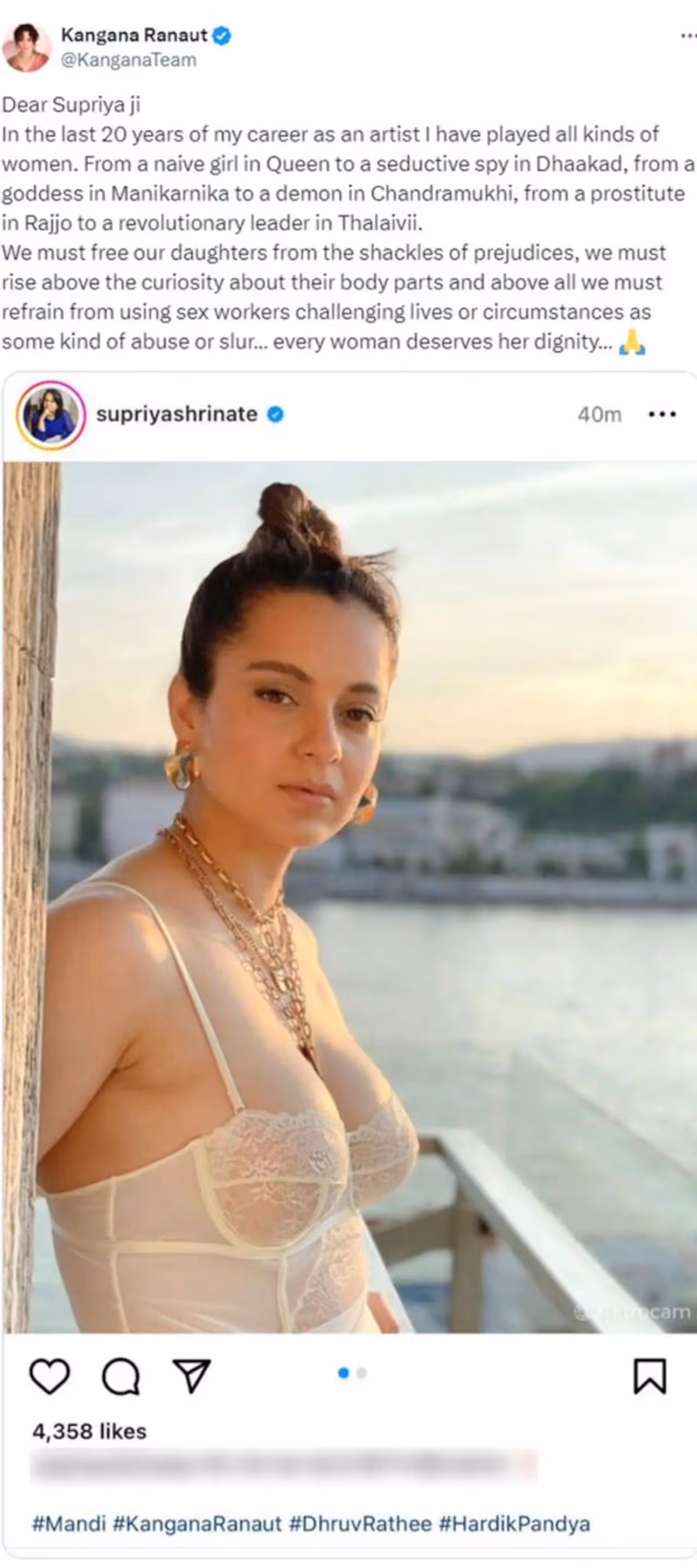 On social media, the 'Queen' actor addressed Shrinate's comments, highlighting her diverse roles, "from a prostitute in Rajjo to a revolutionary leader in Thalaivii."