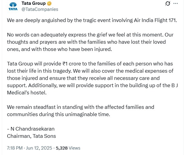 In the wake of the devastating Air India Flight AI171 crash in Ahmedabad, Tata Sons Chairman N Chandrasekaran has announced a comprehensive relief package for victims and their families.