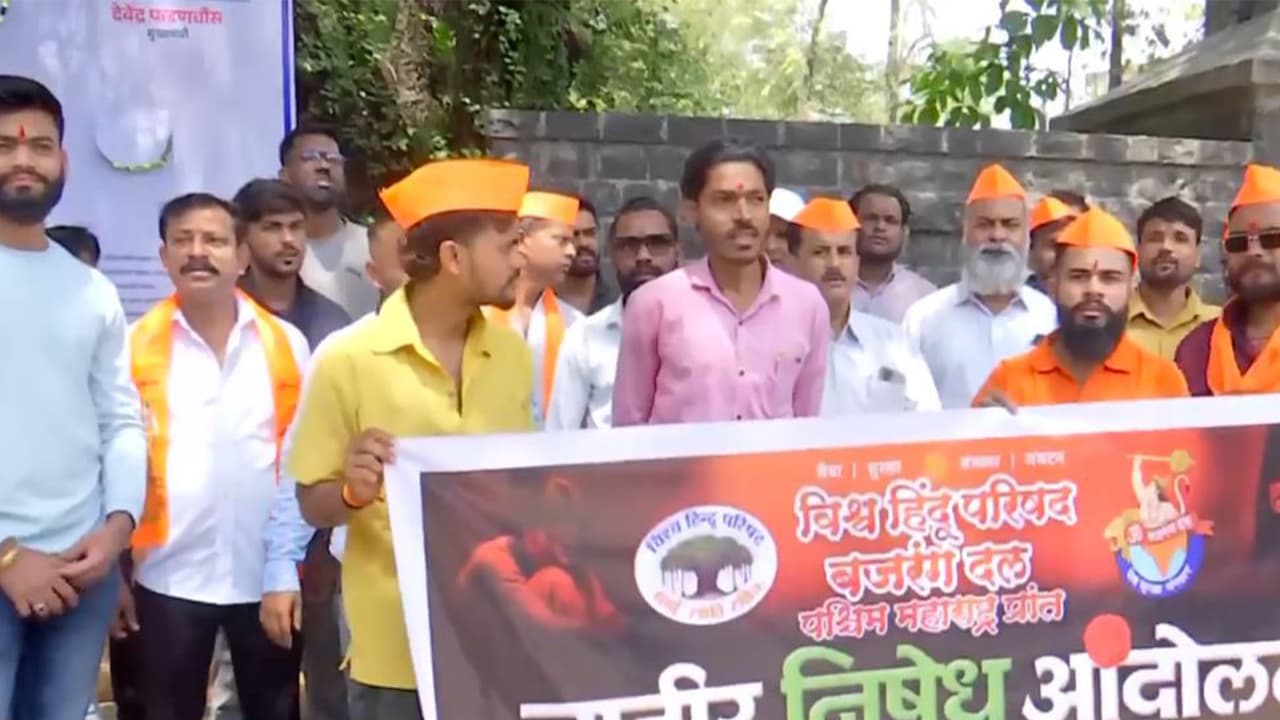 Bajrang Dal members on Friday staged a protest outside the District Collector's Office in Nashik over allegations of religious conversion and sexual harassment at the Tata Consultancy Services office in the city.