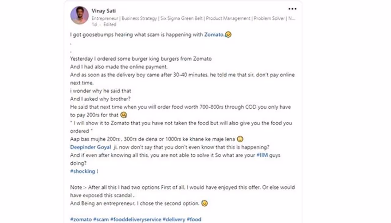 Sati said the delivery agent showed him how to order food worth Rs 700 - Rs 800 and only to pay Rs 200 through COD. After the post was published on LinkedIn, it received over 600 reactions and was reposted 18 times. Zomato CEO Deepinder Goyal also commented on the post, saying, "I am aware of this. Working on closing the gaps."