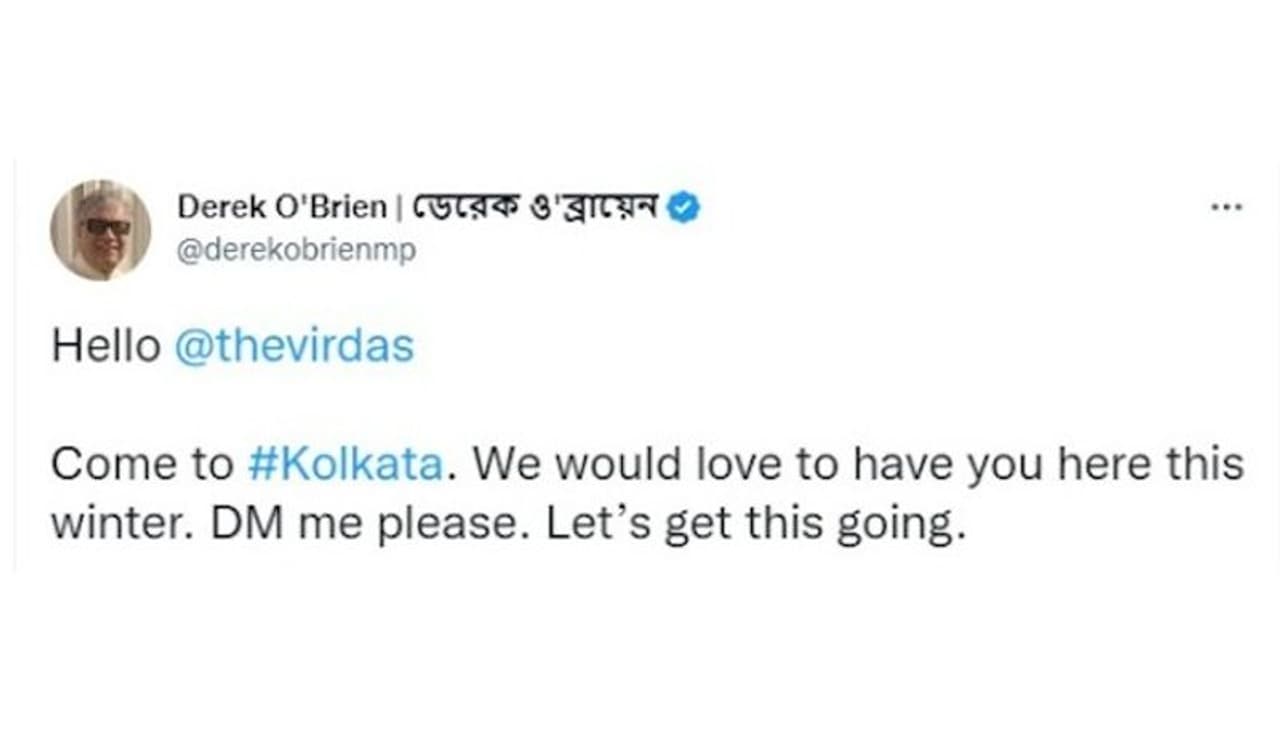 The TMC's Rajya Sabha leader tweeted, "Hello @thevirdas, come to #Kolkata this winter. We would love to have you here. DM me, please. Let's get this going."