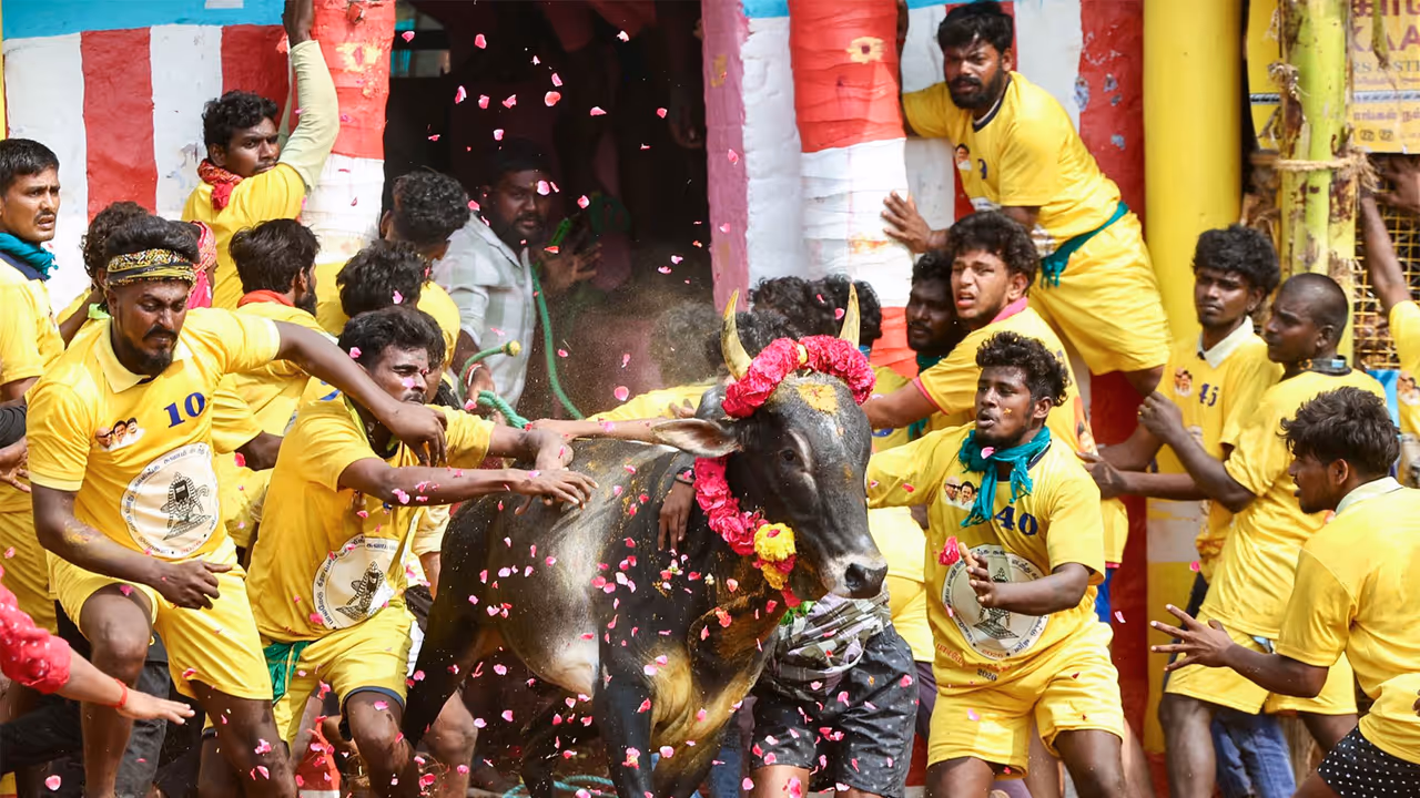 Jallikattu, also known as sallikkattu, is a traditional sport of Tamil Nadu celebrated on the third day of Pongal (Mattu Pongal). The name is coined from two words, Jalli (silver and gold coins) and Kattu (tied). A bull is let loose among a crowd, and whoever tames it will get the coins tied to its horn.