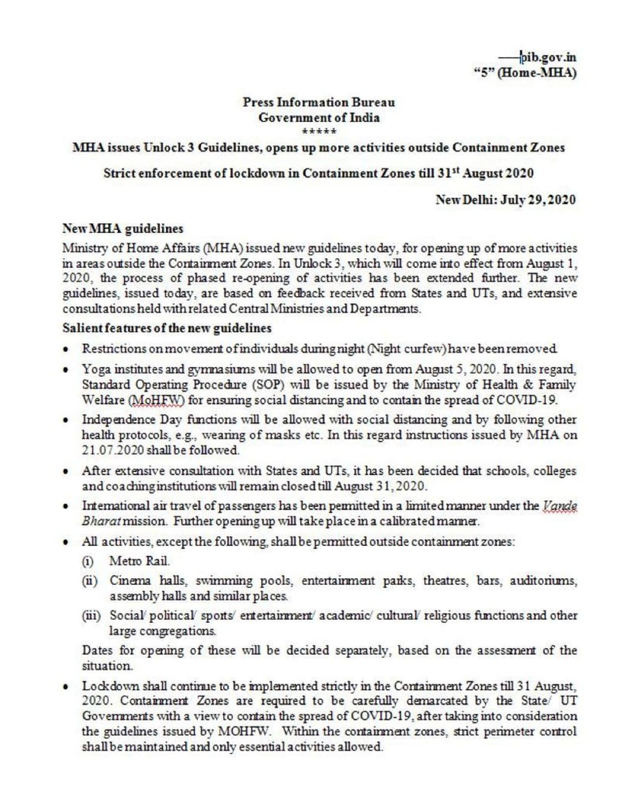 The Ministry of Home Affairs on July 29 issued guidelines for Unlock Phase 3, beginning from August. The new guidelines are based on feedback received from states and UTs. Here are a few key points.
