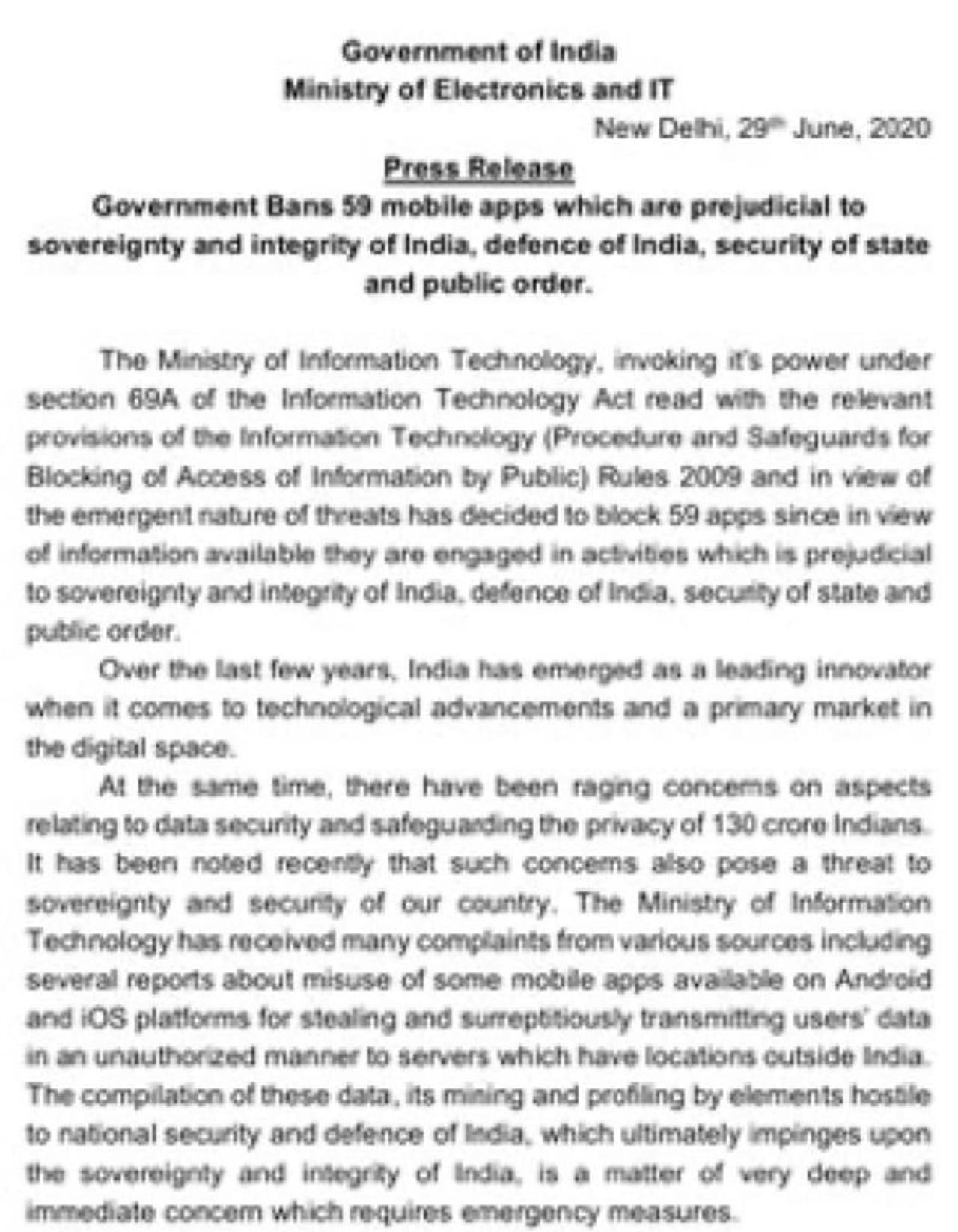 The press release further said that the Ministry of Information Technology has received "many representations raising concerns from citizens regarding security of data and risk to privacy relating to operation of certain apps".